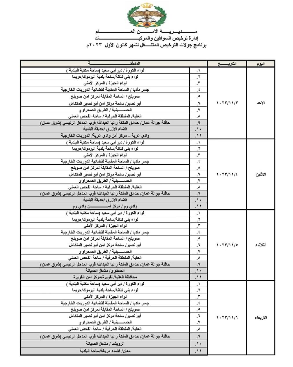 إدارة ترخيص السواقين والمركبات تعلن عن مواعيد العمل بجولات الترخيص المتنقل ضمن المبادرة الابتكارية ( بنوصلك ) خلال شهر كانون الأول لعام 2023م في عدد من مناطق المملكة ، حيث ستكون ساعات الدوام للترخيص المتنقل من يوم الأحد ولغاية يوم الأربعاء من الساعة 8:00 صباحاً وحتى الساعة 2:00 ظهراً، ويوم الخميس من الساعة 8:00 صباحاً ولغاية الساعة 1:00 ظهراً.