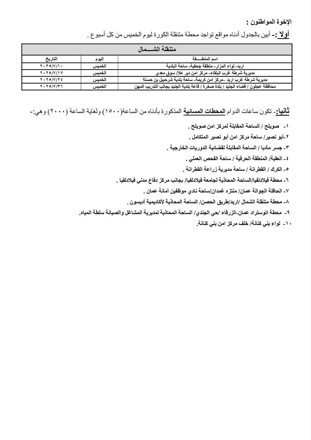 ونذكر الأخوة المواطنين أن إدارة ترخيص السواقين والمركبات افتتحت محطة ترخيص اتوستراد عمّان الزرقاء، وحولت محطة ترخيص بني كنانة إلى مسائية.