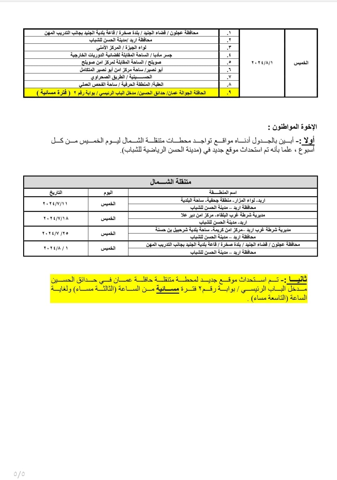 إدارة ترخيص السواقين والمركبات تعلن عن مواعيد العمل بجولات الترخيص المتنقل ضمن المبادرة الابتكارية ( بنوصلك ) خلال شهر تموز لعام 2024 في عدد من مناطق المملكة ، حيث ستكون ساعات الدوام للترخيص المتنقل من يوم الأحد ولغاية يوم الأربعاء من الساعة 8:00 صباحاً وحتى الساعة 2:00 ظهراً، ويوم الخميس من الساعة 8:00 صباحاً ولغاية الساعة 1:00 ظهراً.