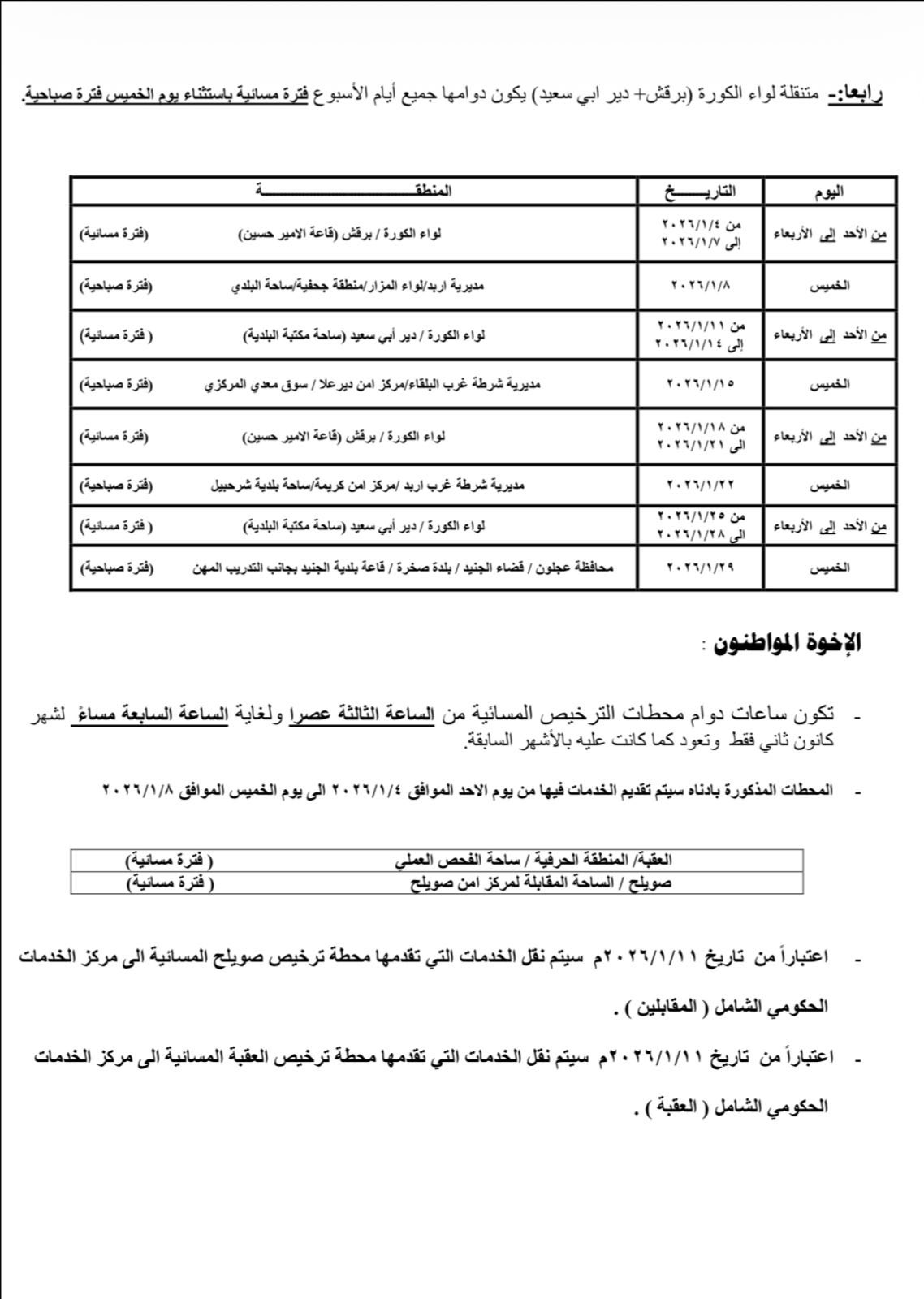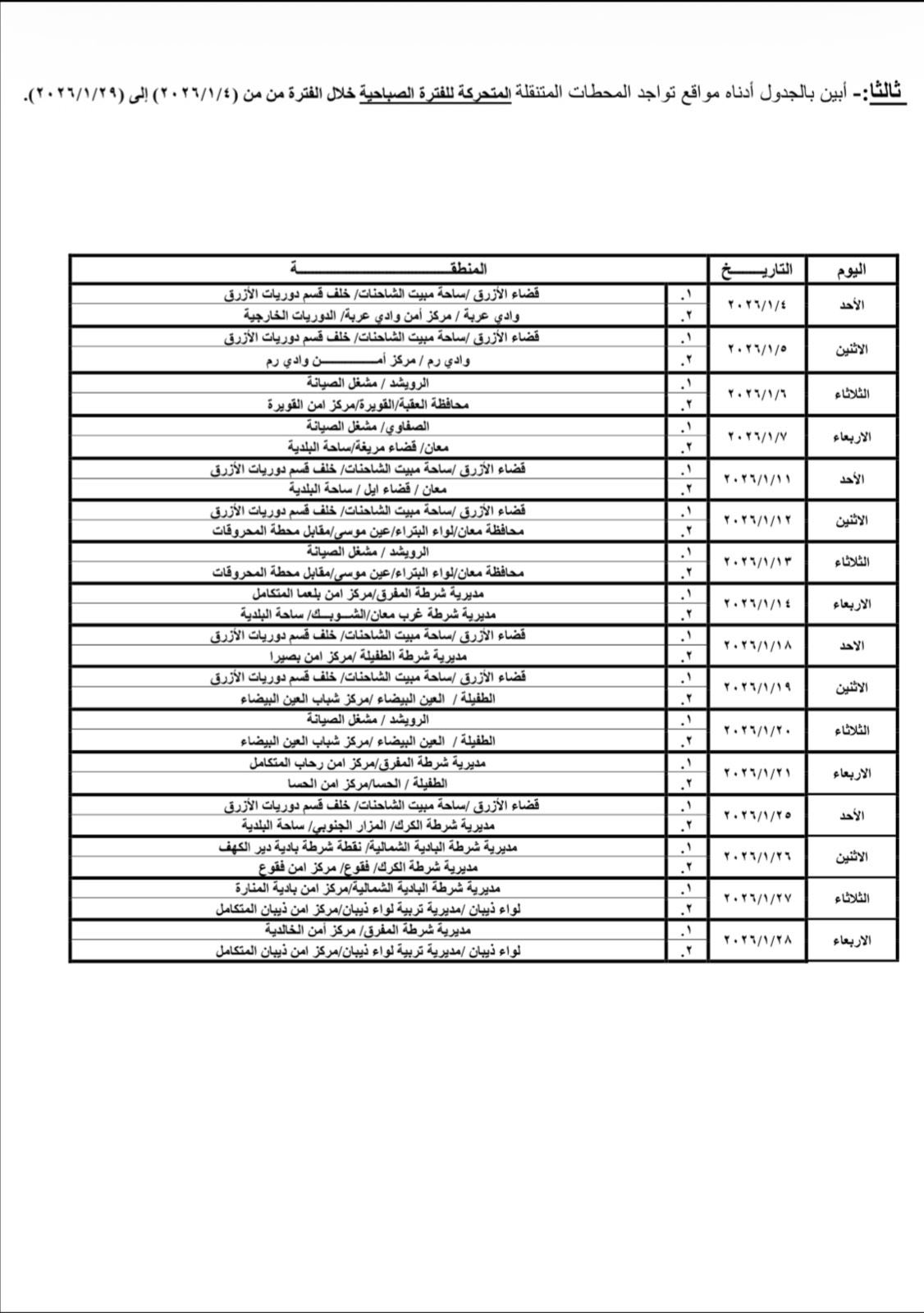 تعلن إدارة ترخيص السواقين والمركبات عن مواعيد العمل بجولات الترخيص المتنقل الصباحي والمسائي ضمن المبادرة الابتكارية ( بنوصلك ) خلال شهر كانون الثاني لعام 2026 في عدد من مناطق المملكة.