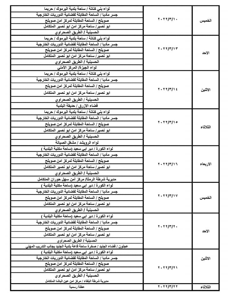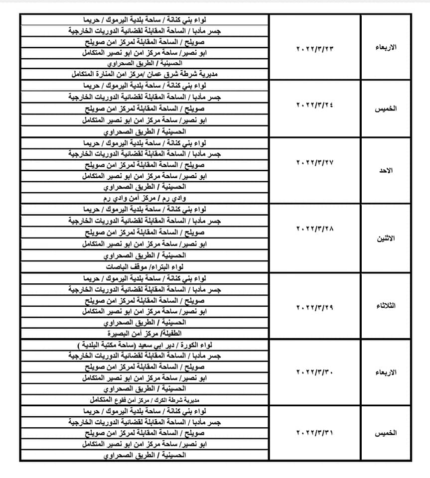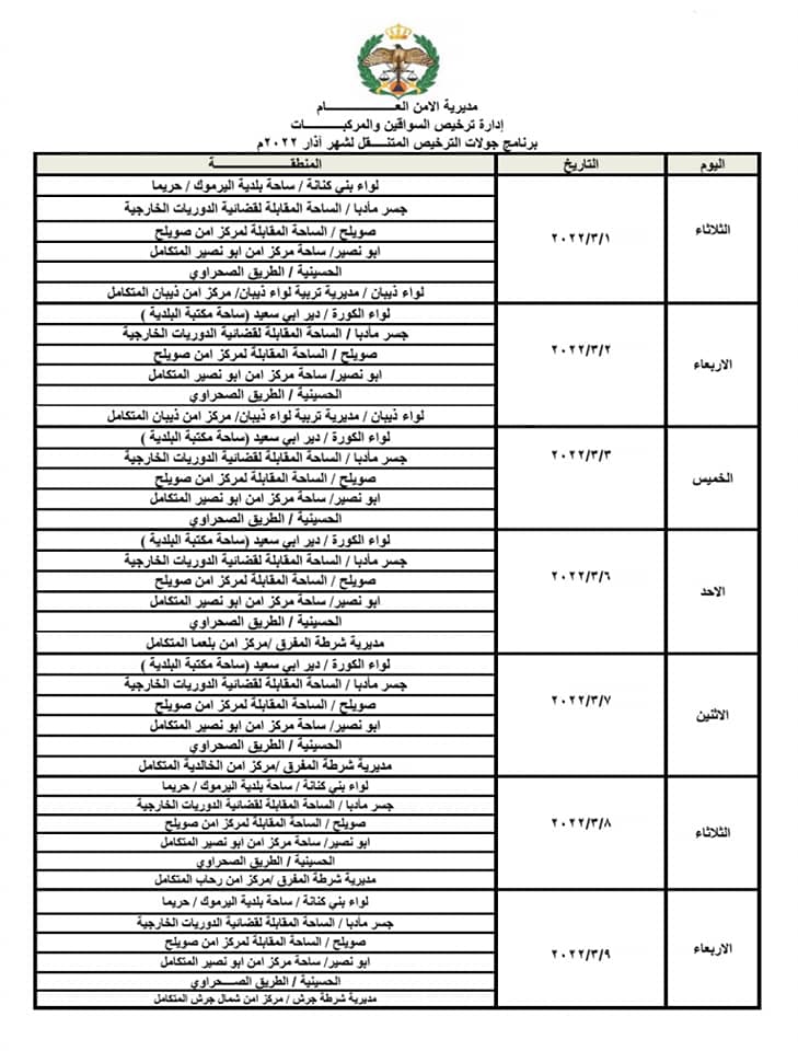 استكمالاً للجولات التي تنظمها إدارة ترخيص السواقين والمركبات ضمن مبادرتها الابتكارية ( بنوصلك ), دعت الإدارة المواطنين من القاطنين في المناطق التالية للاستفادة من خدمات الترخيص المتنقلة التي تقدمها المحطات المتنقلة للمواطنين ضمن هذه المناطق وحسب التواريخ والأماكن التالية من الساعة الثامنة والنصف صباحاً ولغاية الساعة الثانية ظهراً :-