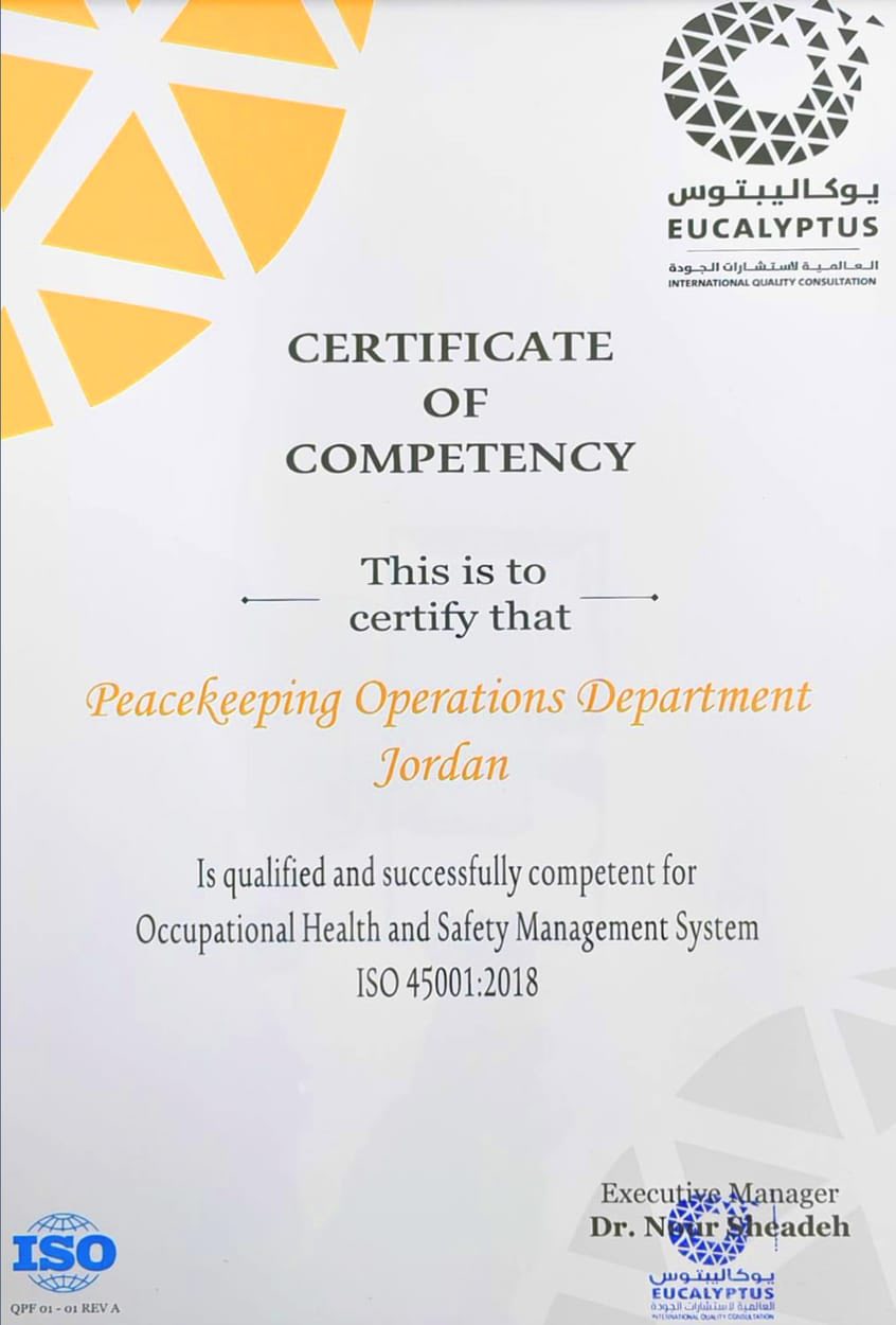 كما تُمثل الشهادة والتي تسلمتها إدارة عمليات حفظ السلام بحضور مساعد مدير الأمن العام للعمليات والتدريب العميد الدكتور محمد العمري، وممثلي شركة (Eucalyptus) لاستشارات الجودة، المكانة الرائدة التي وصل إليها الأردن في مجالات ترسيخ الأمن والإستقرار وخدمة المجتمعات ضمن مسارات حفظ السلم والأمن الدوليين، والمنسجمة مع رؤى وتوجيهات القيادة الهاشمية في تعزيز مكانة المملكة كنموذج عالمي في تحقيق السلم والأمن الدوليين وفق أفضل الممارسات العالمية، المتوافقة ومختلف التحولات الأمنية والمجتمعية.
