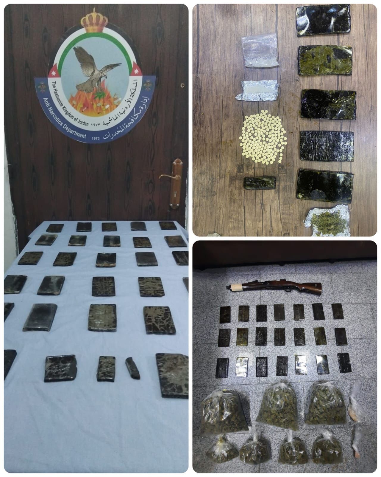 وفي إقليم الجنوب تم التعامل مع قضيتين نوعيتين دوهم في الأولى تاجران للمخدرات على الطريق الصحراوي في أثناء نقلهما لكميات من المخدرات من إحدى محافظات الجنوب وضُبط بحوزتهما ٢٨ كف حشيش ، وفي آخر القضايا في محافظة الكرك جرى تتبع شخص من مروجي المخدرات ومداهمته وضُبط بحوزته ٦ كفوف من مادة الحشيش المخدرة.