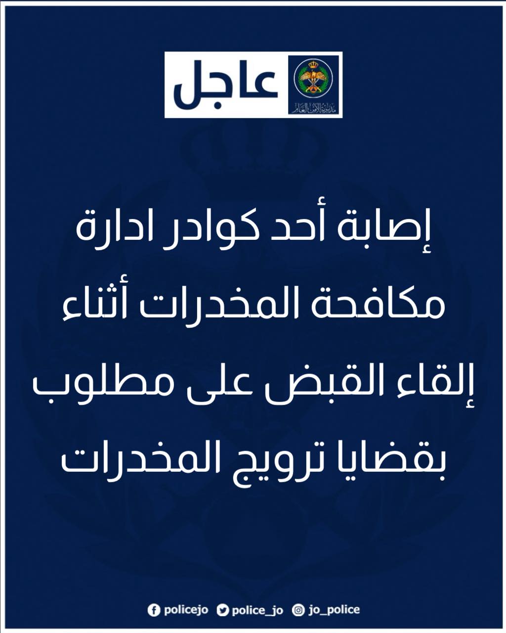 قال الناطق الإعلامي باسم مديرية الأمن العام، إن قوة أمنيّة تابعت أمس في إحدى مناطق العاصمة أحد المطلوبين بترويج المخدرات وبحقه ثلاثة قيود سابقة بقضايا المخدرات اضافة لسوابق اخرى بقضايا متنوعة بعد التأكد من حيازته لكمية من تلك المواد بغرض بيعها .