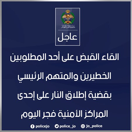 الناطق الإعلامي باسم مديرية الأمن العام :- في عملية نوعية فجر اليوم إلقاء القبض على أحد المطلوبين الخطيرين والمتهم الرئيسي بقضية إطلاق النار على إحدى المراكز الأمنية .