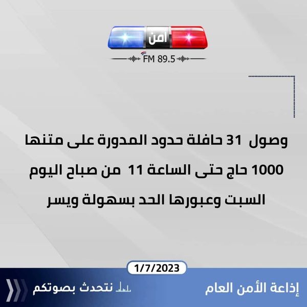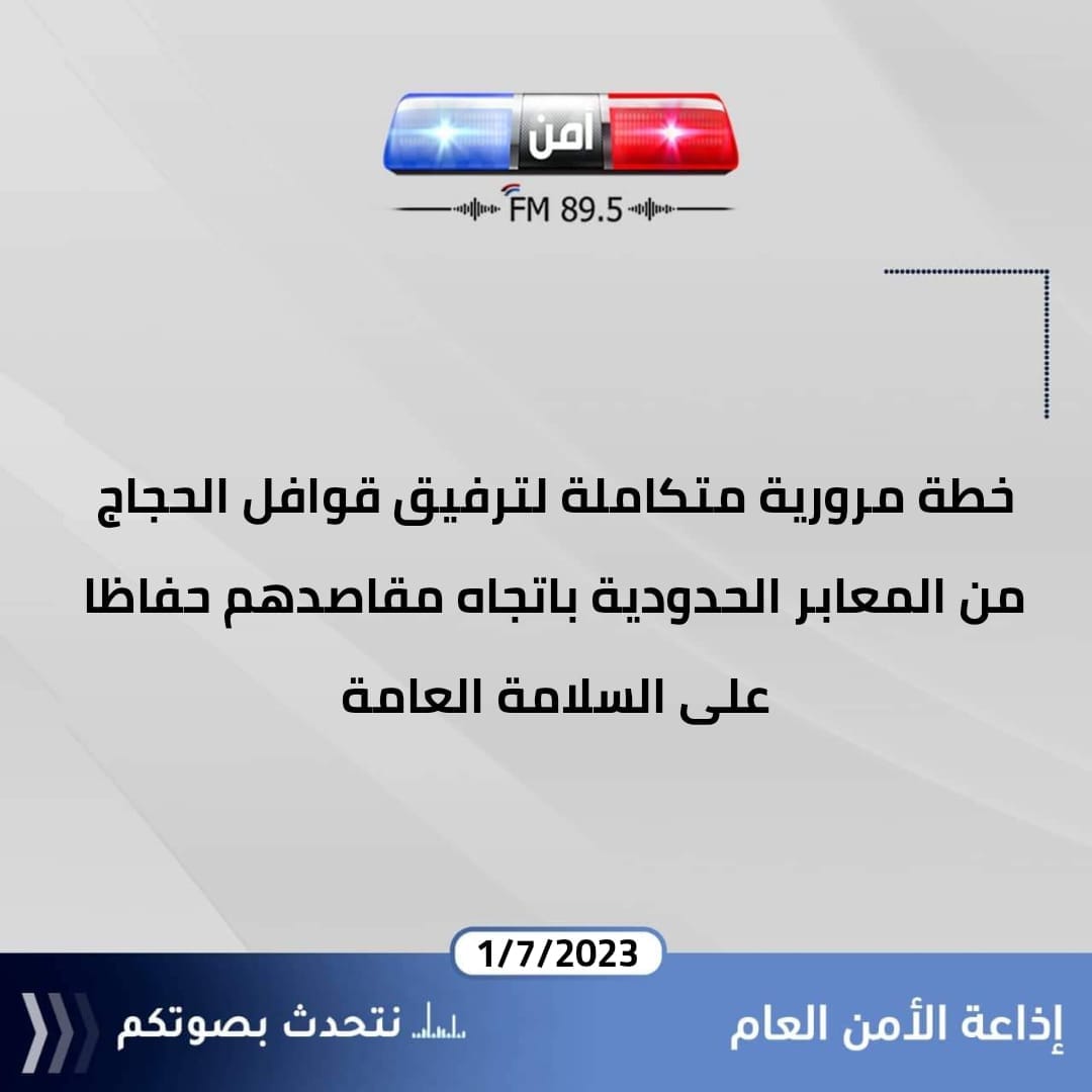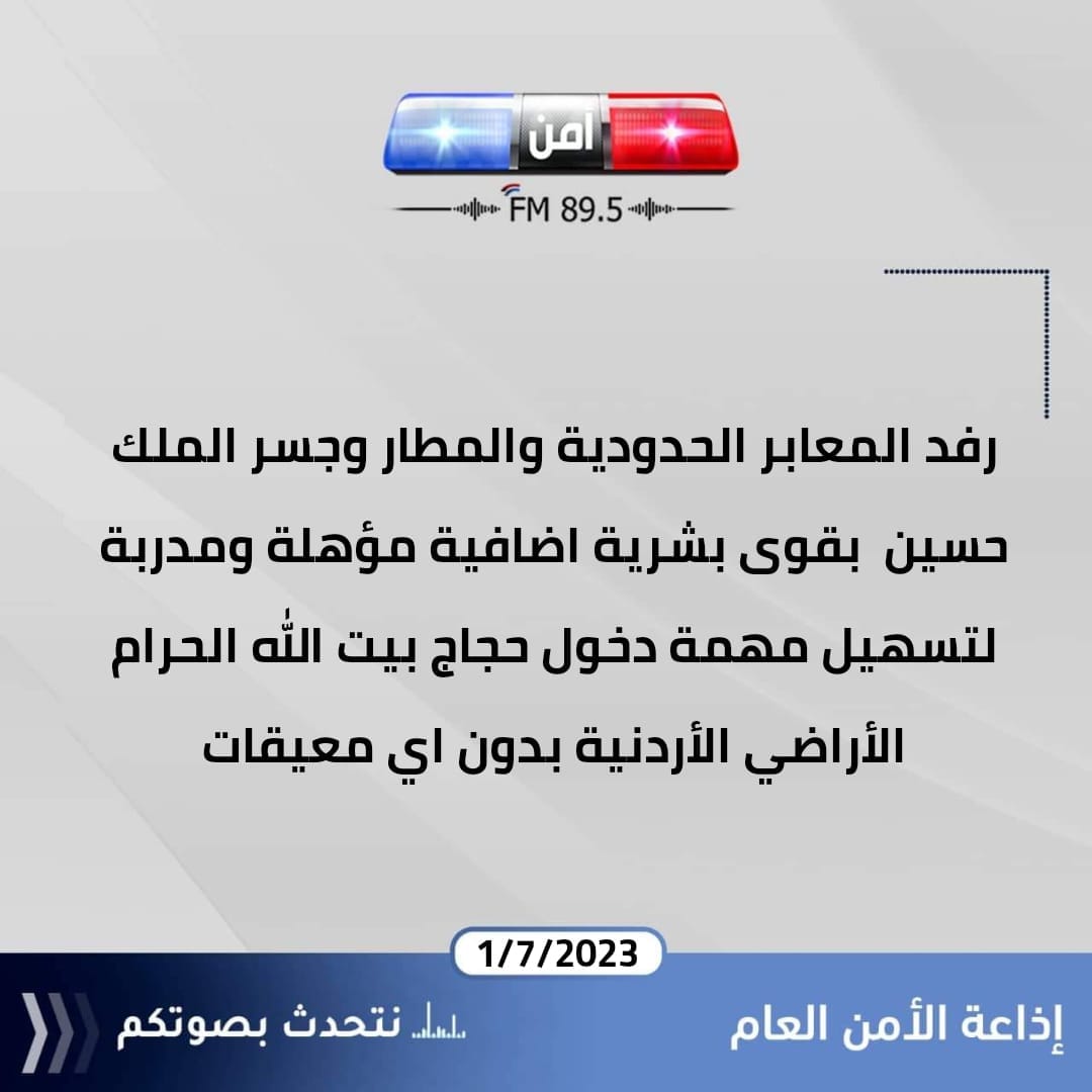 عمان الأول من تموز (أمن إف إم ) أكد العقيد احمد السعودي مدير حدود المدورة أنه وبتوجيهات من مدير الأمن العام اللواء عبيدالله المعايطة ومدير ادارة الاقامة والحدود أنه تم وضع كافة الترتيبات اللازمة لاستقبال حجاج بيت الله الحرام . حيث تم رفد المركز الحدودي بالكادر البشري المؤهل والمدرب لإنهاء كافة المعاملات بأسرع وقت ممكن توفيرا للوقت والجهد على الحجاج .