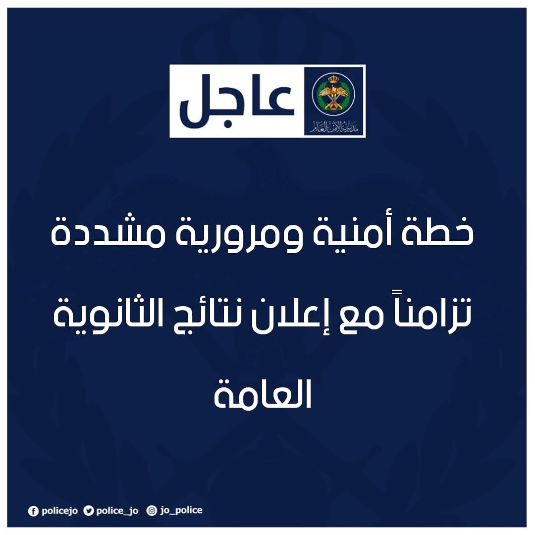 تُباشر مديرية الأمن العام تطبيق خطة أمنية ومرورية مشددة تزامناً مع إعلان نتائج الثانوية العامة، بهدف توفير الأجواء الآمنة للمواطنين، والحيلولة دون وقوع أية تجاوزات تهدد سلامة الأرواح والممتلكات، مثل إطلاق العيارات النارية، والمواكب المعيقة، والخروج من المركبات.