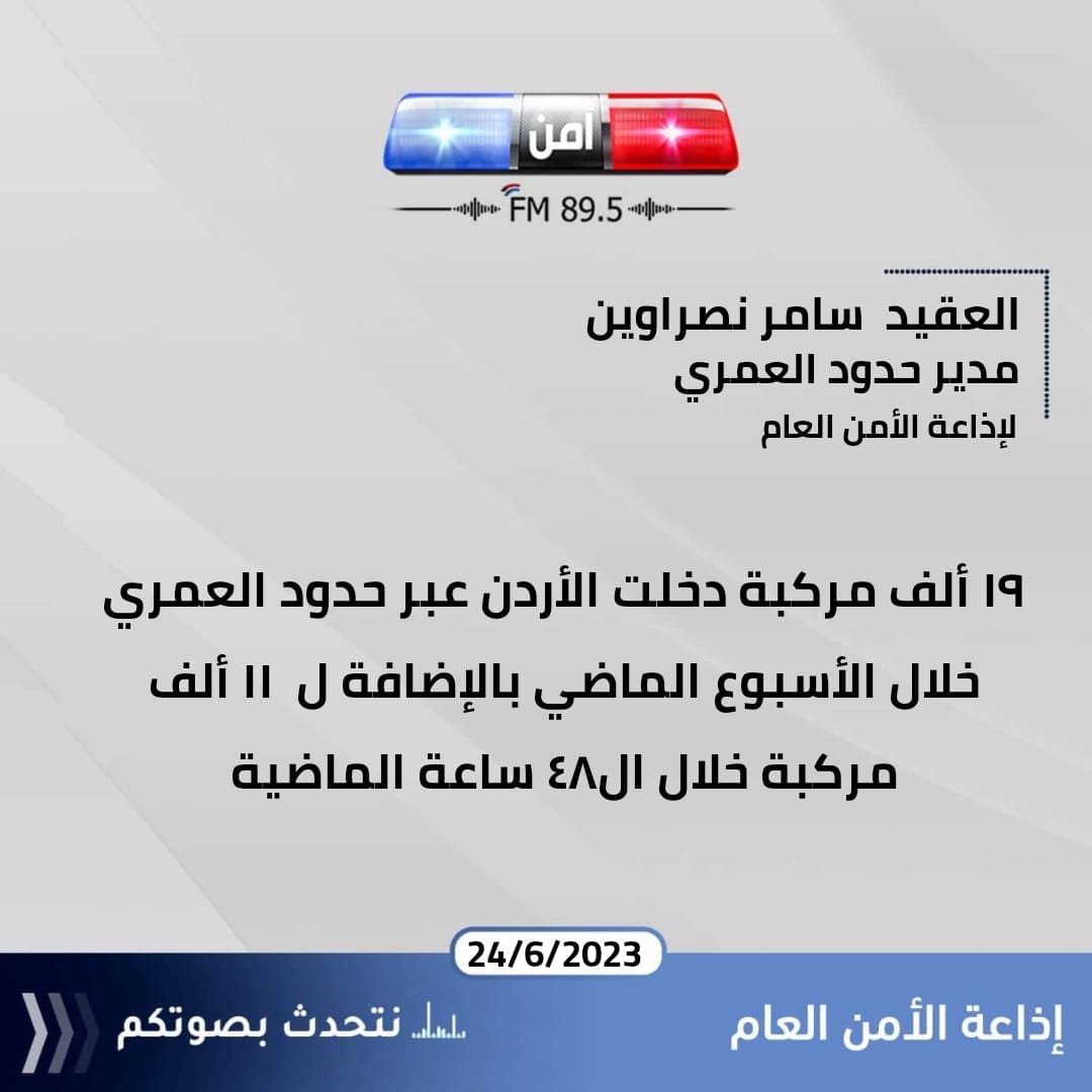 (19) ألف مركبة دخلت الأردن عبر حدود العمري خلال الإسبوع الماضي بالإضافة لـ 11 ألف مركبة خلال الـ48 ساعة الماضية.