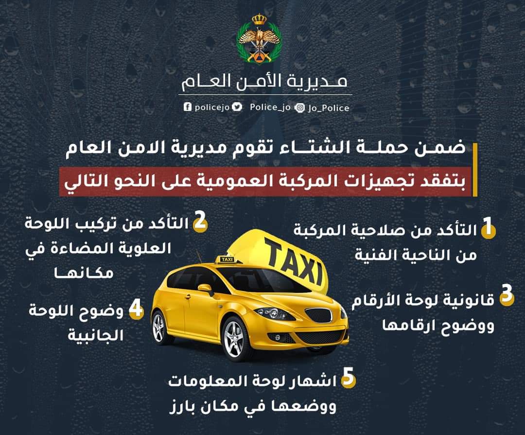 وفي هذه السياق أطلقت المديرية حملتها التفتيشية المرورية السنوية للتأكد من صلاحية المركبات وجاهزيتها للسير على الطرق خلال فصل الشتاء، وتوافر عناصر السلامة فيها، والتي ستنفذ من قبل الإدارات المرورية (السير، والترخيص، والدوريات الخارجية) والإدارة الملكية لحماية البيئة، ومختصين بالفحص الفني من إدارة الصيانة.