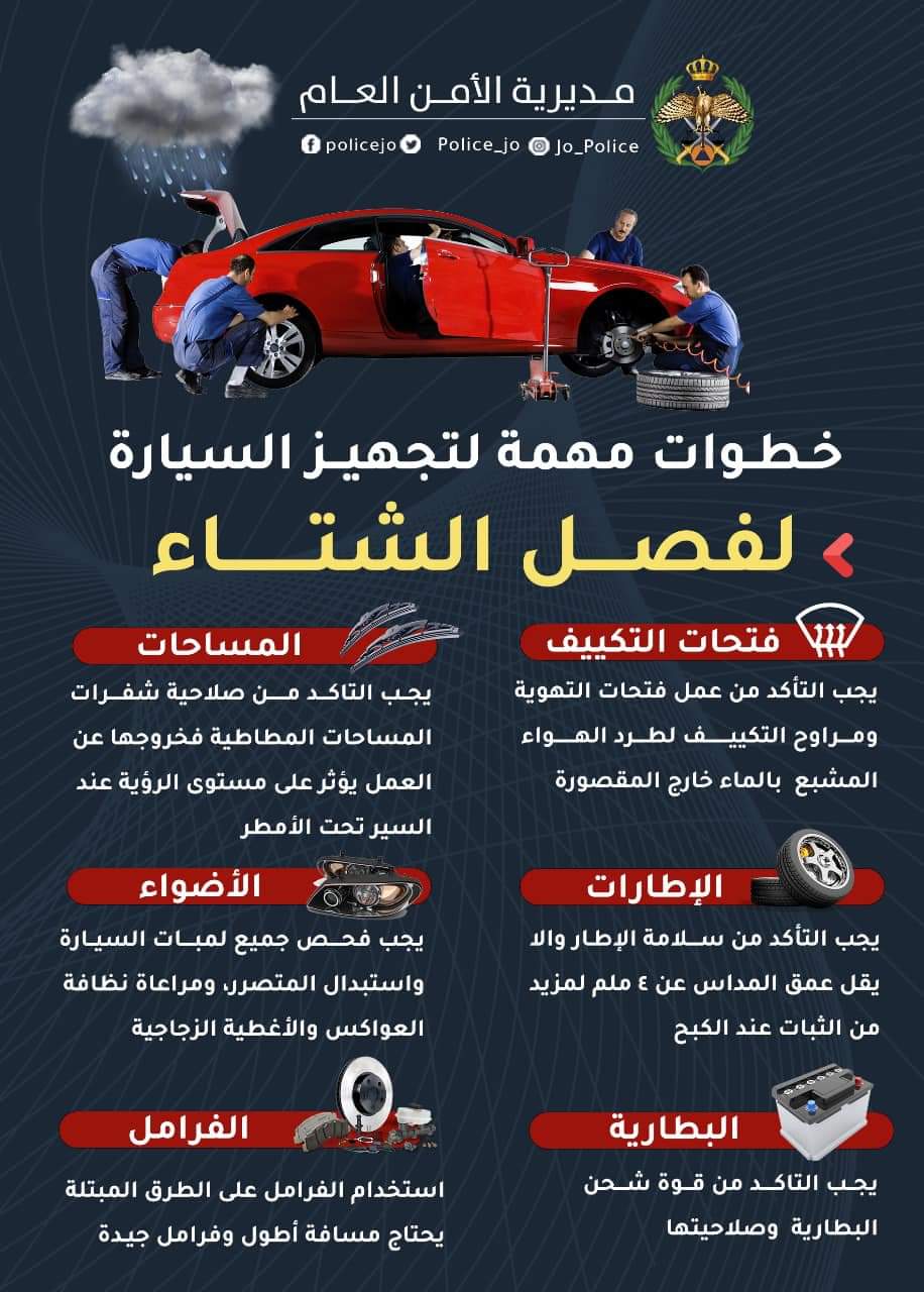 وتدعو مديرية الامن العام المواطنين إلى ضرورة التعاون مع مرتبات مديرية الأمن العام واتباع كافة الإرشادات والتعليمات وإجراء الصيانة المناسبة لمركباتهم للحفاظ على سلامتهم وسلامة الآخرين خلال فصل الشتاء، وتفقد وسائل التدفئة المنزلية، واجراء الصيانة لها قبل البدء باستخدامها عند الحاجة.