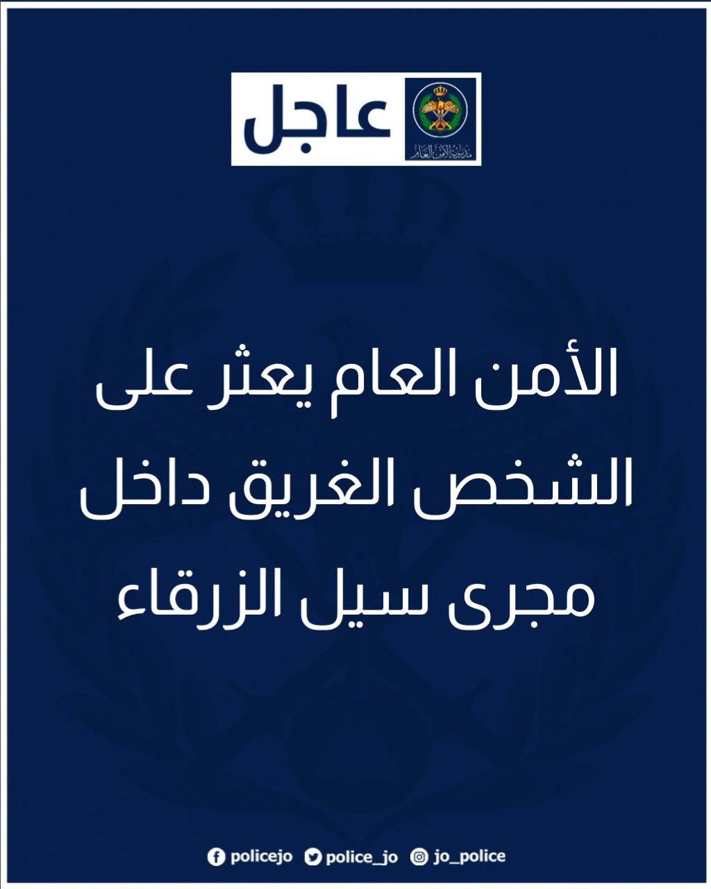 عثرت كوادر البحث والإنقاذ وفرق الغطس على جثة الشخص الذي فُقد إثر تعرضه للغرق في سيل الزرقاء، حيث جرى انتشال الجثة من الموقع بعد عمليات بحث وتمشيط، وتم إخلاء الجثة إلى مركز الطب الشرعي، فيما باشرت الجهات المختصة التحقيق في ملابسات الحادثة.