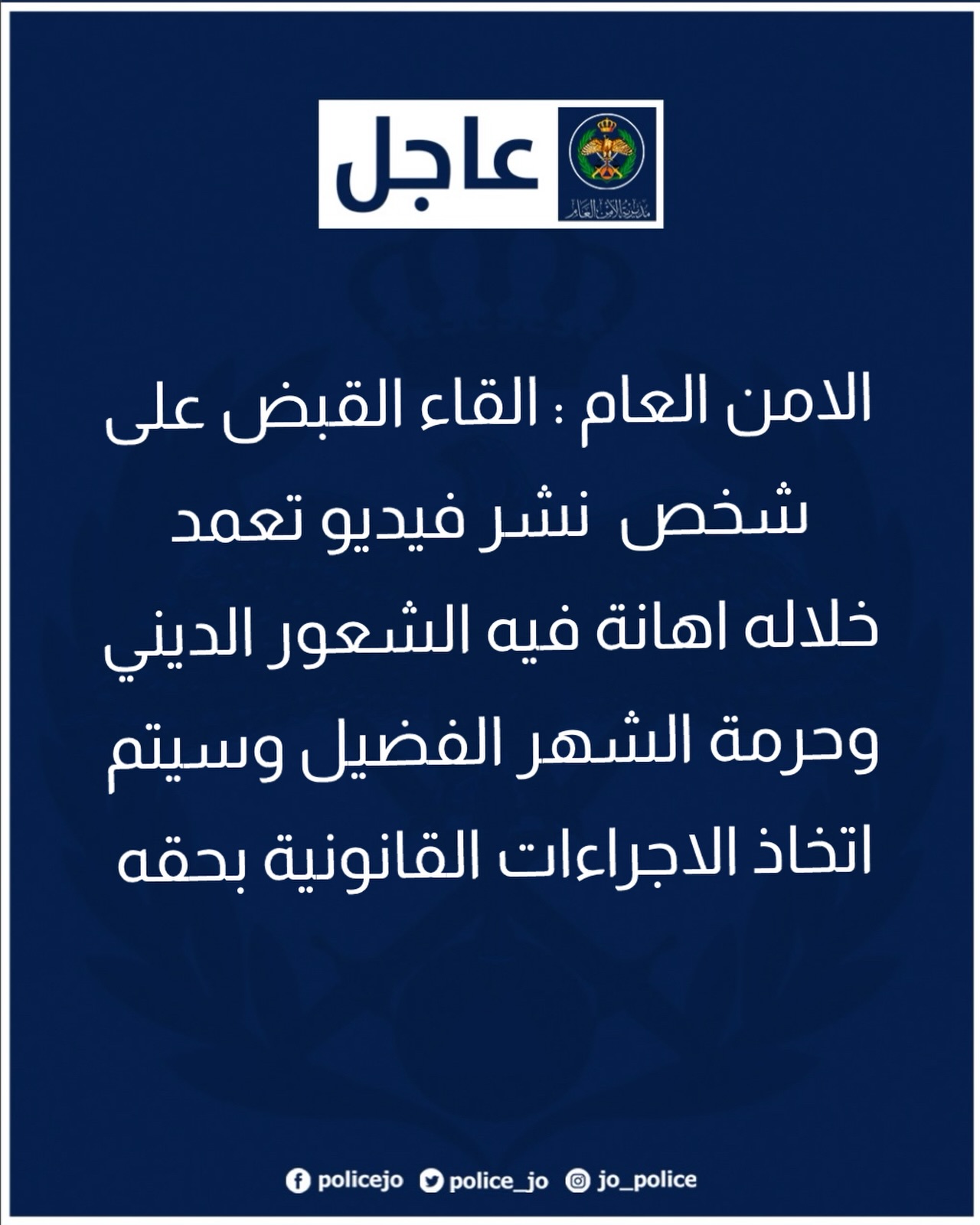 الامن العام : القاء القبض على شخص نشر فيديو تعمد خلاله اهانة فيه الشعور الديني وحرمة الشهر الفضيل وسيتم اتخاذ الاجراءات القانونية بحقه
