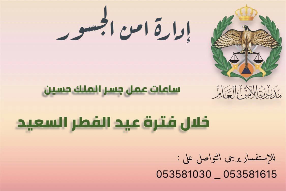 *الإخوة المسافرين المغادرين والقادمين عبر جسر الملك حسين سوف يتم التعديل على ساعات العمل الرسمي اعتباراً من يوم الاثنين الموافق 8 /4 /2024م قبل وبعد عيد الفطر السعيد وعلى النحو التالي :