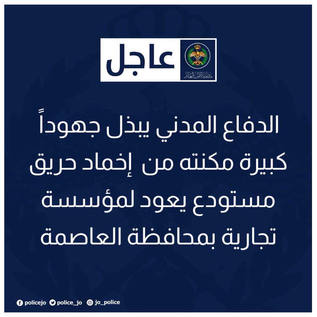 قال الناطق الاعلامي باسم مديرية الأمن العام أن فرق الاطفاء المتخصصة في مديرية دفاع مدني شرق عمان وباسناد من مديريات دفاع مدني وسط عمان و الزرقاء ومجموعة إسناد العاصمة والشرطة وقوات الدرك وأمانة عمان تعاملت ظهر اليوم مع حريق شب داخل هنجر وساحات خارجية تستخدم كمستودع يعود لأحد المؤسسات التجارية قدرت مساحته بـ(٥٠٠٠) متر ويحتوي على عدد صناعية واجهزة كهربائية وادوات منزلية ومواد بناء بمنطقة طريق الحزام.