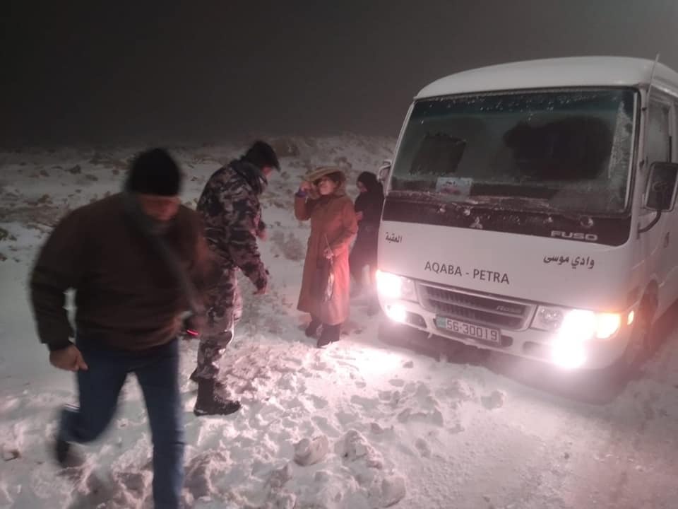 قال الناطق الإعلامي باسم مديرية الأمن العام أن كوادر الإنقاذ والإسعاف في مديرية دفاع مدني معان قامت بإخلاء ٦ مواطنين علقت الحافلة التي كانت تقلهم بسبب تراكم الثلوج في منطقة الطيبة - وادي موسى ، وتم نقلهم وتأمينهم وتقديم يد العون لهم