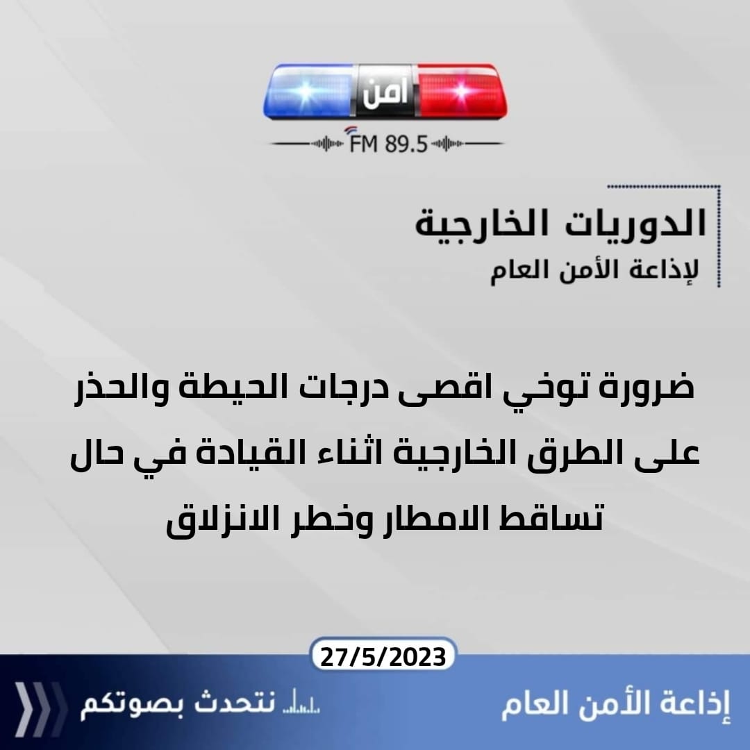 ضرورة توخي اقصى درجات الحيطة والحذر على الطرق الخارجية اثناء القيادة في حال تساقط الامطار وخطر الانزلاق.