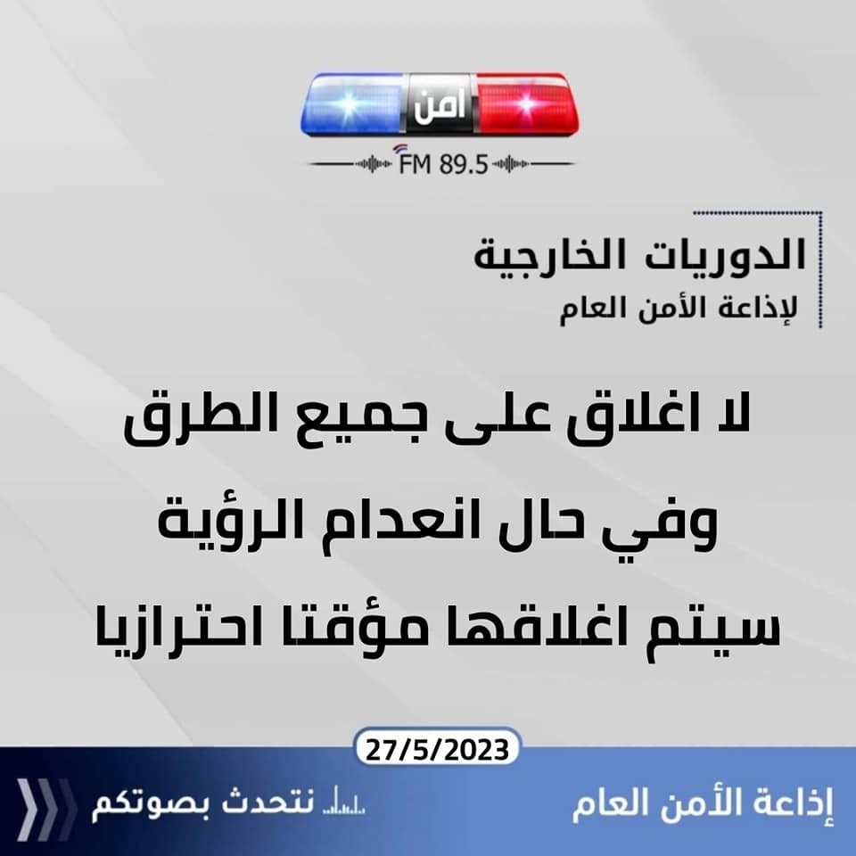 أكد ضابط عمليات الدوريات الخارجية انه لا اغلاق على أي من الطرق الخارجية لغاية اللحظة مضيفا انه وفي حال انعدام الرؤية سيتم اغلاقها احترازيا بشكل مؤقت