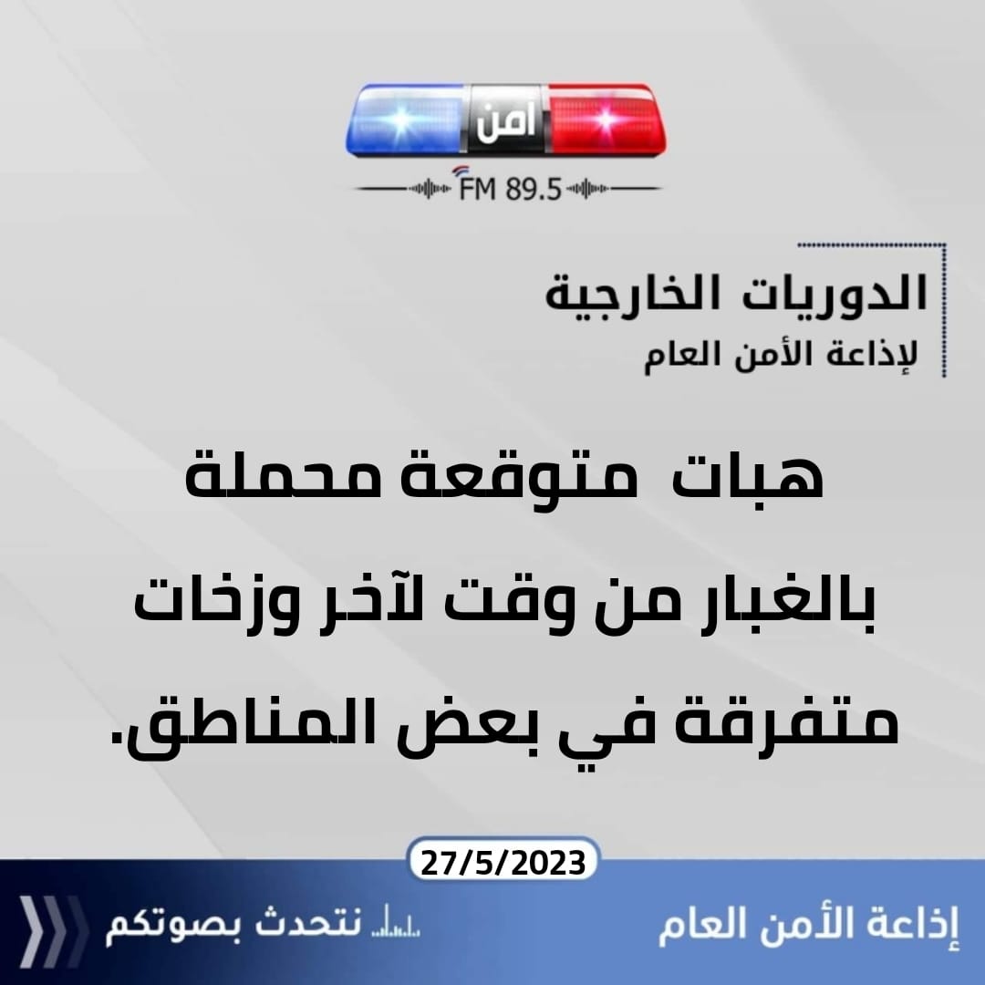 وأضاف مندوب الدوريات الخارجية في حديثه لإذاعة الأمن العام أن طرق المملكة الخارجية الجنوبية والشرقية تتعرض لهبات غبارية من وقت لآخر وزخات متفرقة في بعض المناطق بحسب دائرة الارصاد الجوية