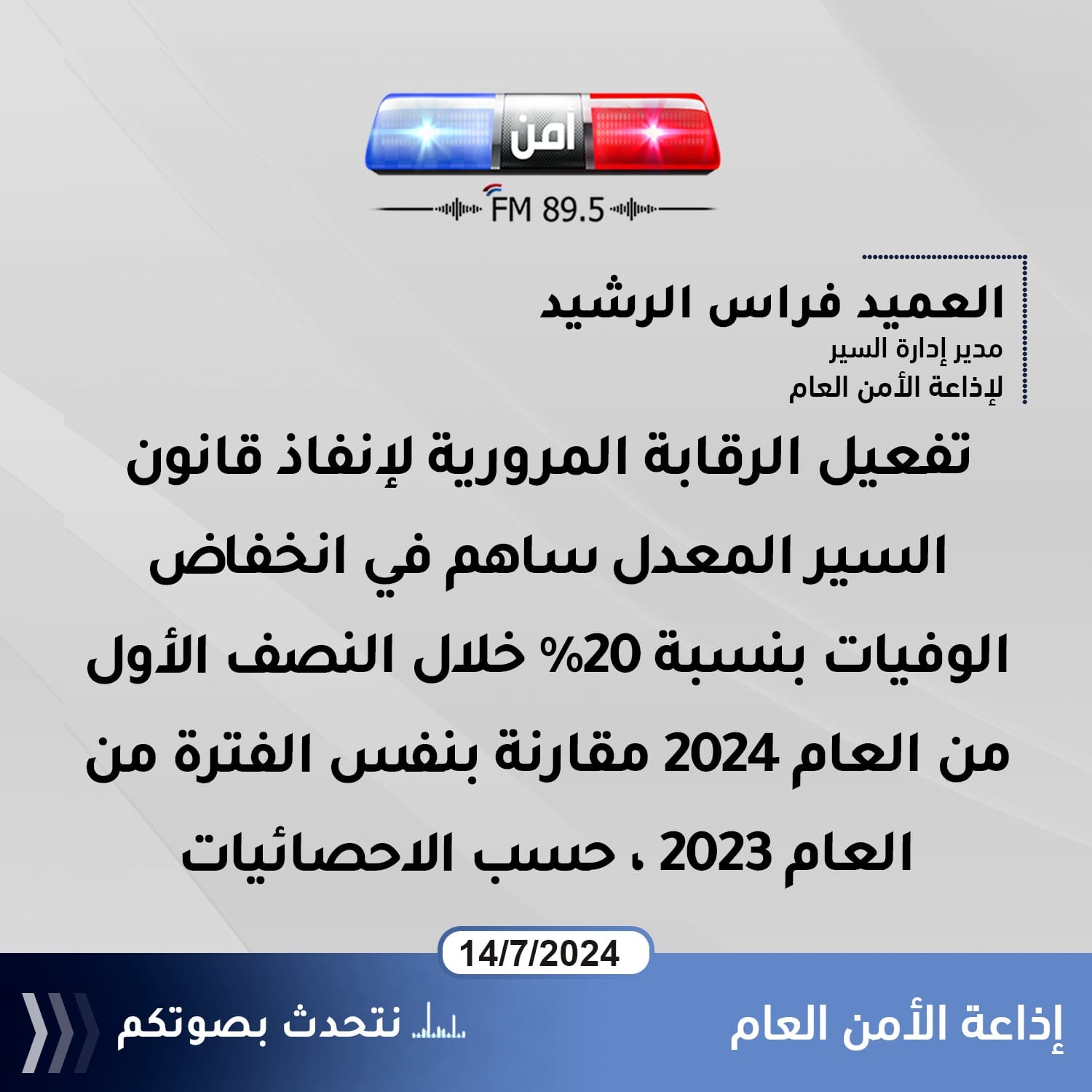 _تفعيل الرقابة المرورية لإنفاذ قانون السير المعدل ساهم في انخفاض الوفيات بنسبة 20% خلال النصف الأول من العام 2024 مقارنة بنفس الفترة من العام 2023 ، حسب الاحصائيات.