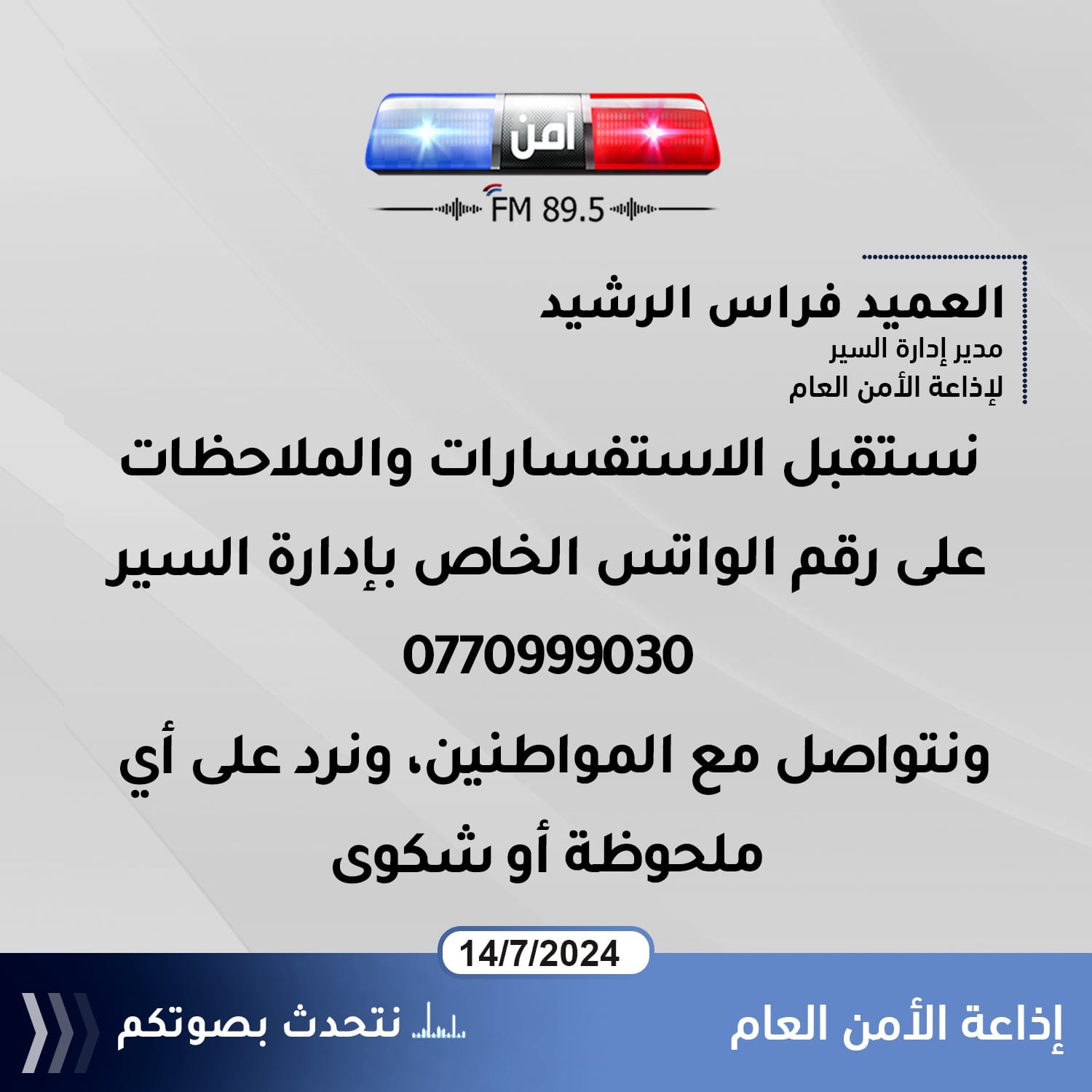 _ نستقبل الاستفسارات والملاحظات على رقم الواتس الخاص بإدارة السير0770999030 ونتواصل مع المواطنين، ونرد على أي ملحوظة أو شكوى