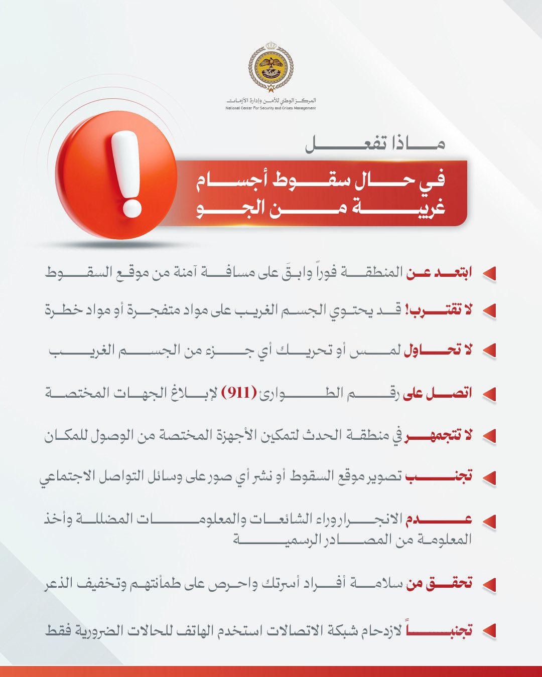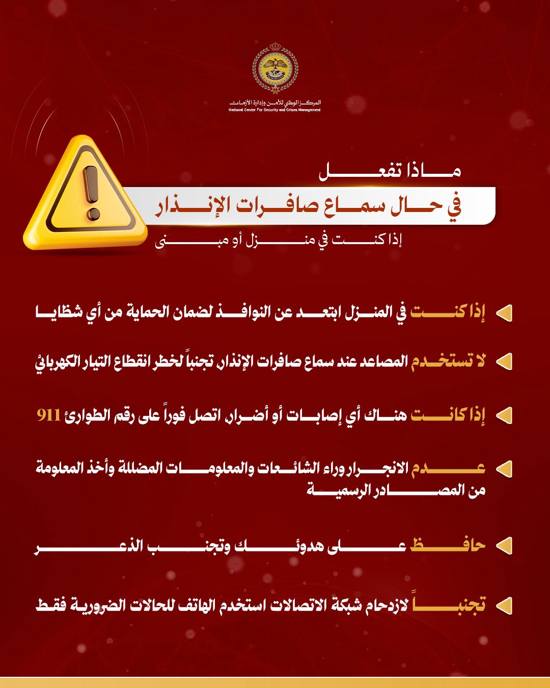 المركز الوطني للامن وادارة الازمات يصدر ارشادات توعوية للتعامل مع الاحداث الجارية حفاظا على السلامة العامة.
