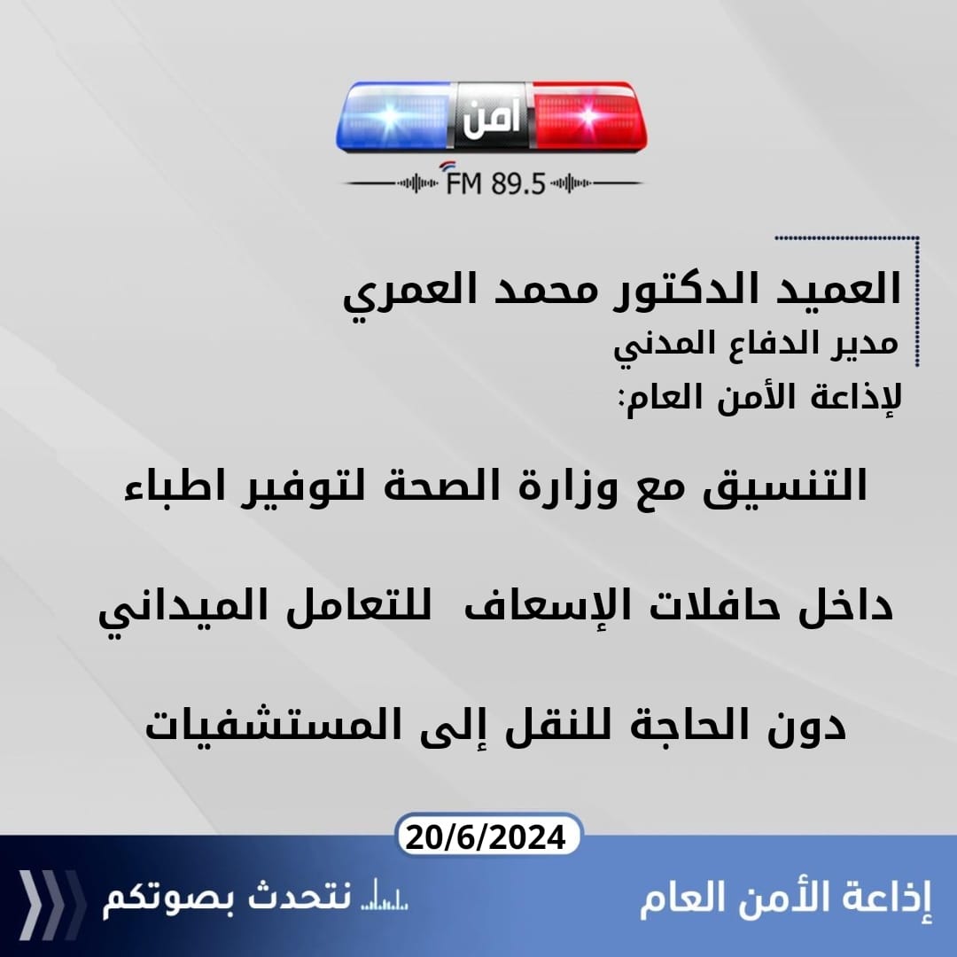 وأضاف العميد الدكتور محمد العمري مدير الدفاع المدني في حديثه لإذاعة الأمن العام أنه وبعد التنسيق مع الشركاء وخاصة وزارة الصحة فقد تواجد أطباء داخل حافلات الإسعاف لتقديم الخدمات الطبية دون الحاجة للنقل إلى المستشفيات.