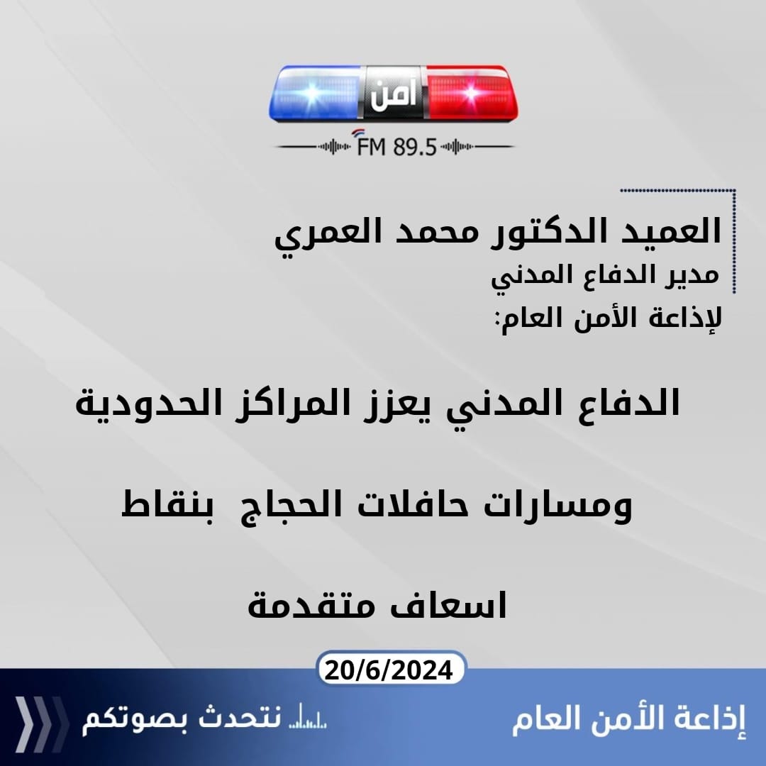 الدفاع المدني يعزز المراكز الحدودية ومسارات حافلات الحجاج بنقاط اسعاف متقدمة.
