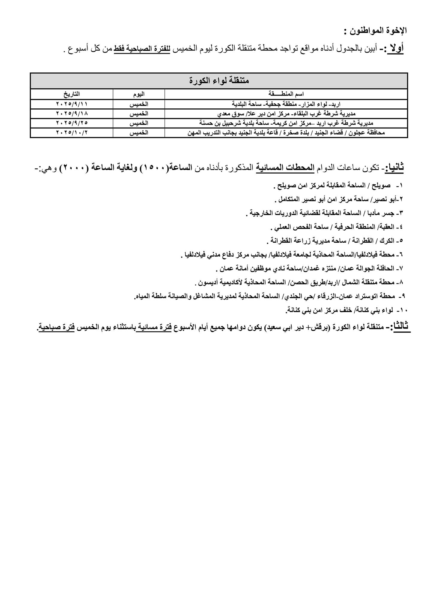 حيث ستكون ساعات الدوام الصباحي من يوم الأحد ولغاية يوم الأربعاء من الساعة 8:00 صباحًا وحتى الساعة 2:00 ظهرًا، ويوم الخميس من الساعة 8:00 صباحًا ولغاية الساعة 1:00 ظهرًا ودوام المحطات المسائية من الساعة 3:00 عصراً حتى الساعة 8:00 مساءً.