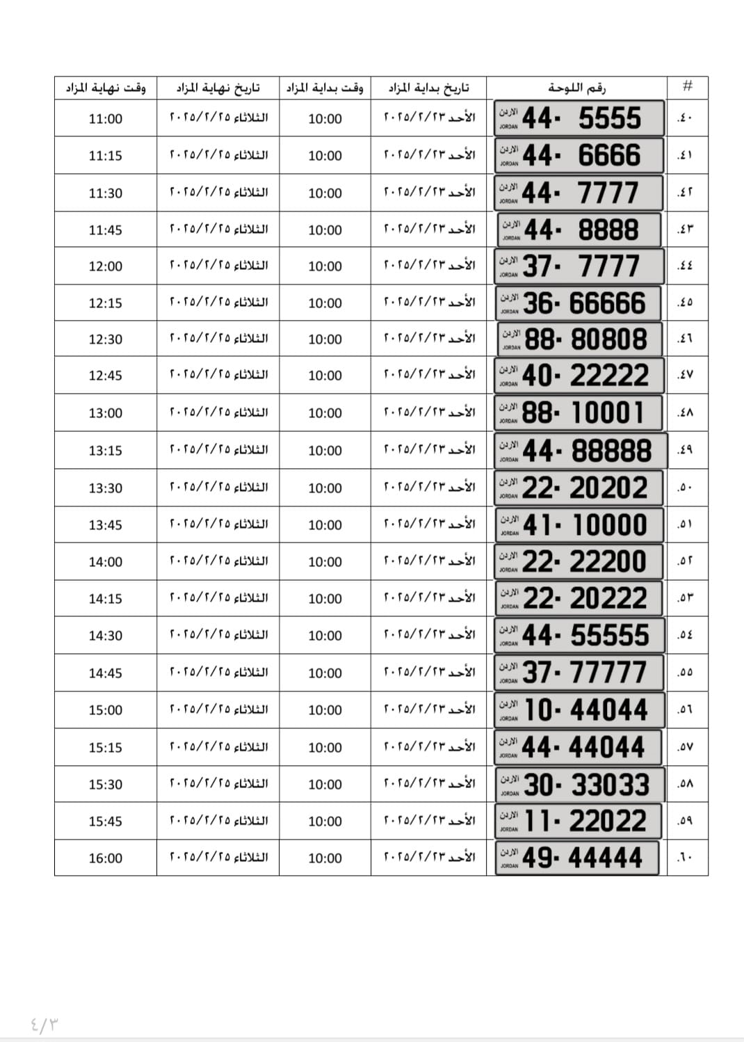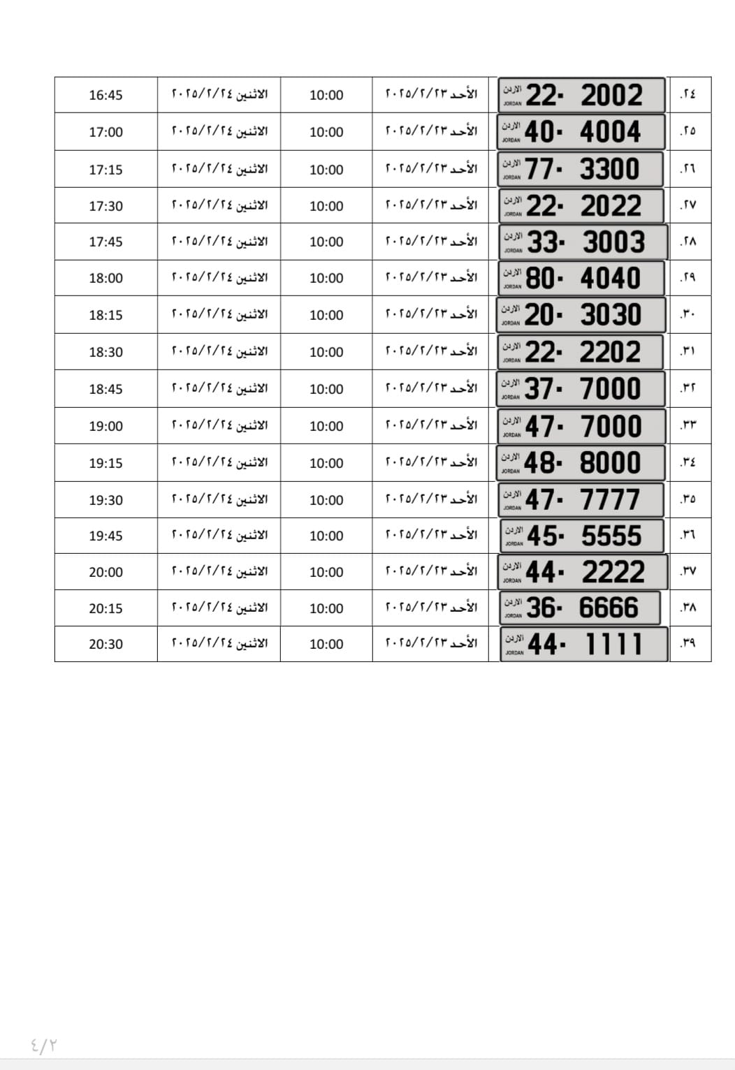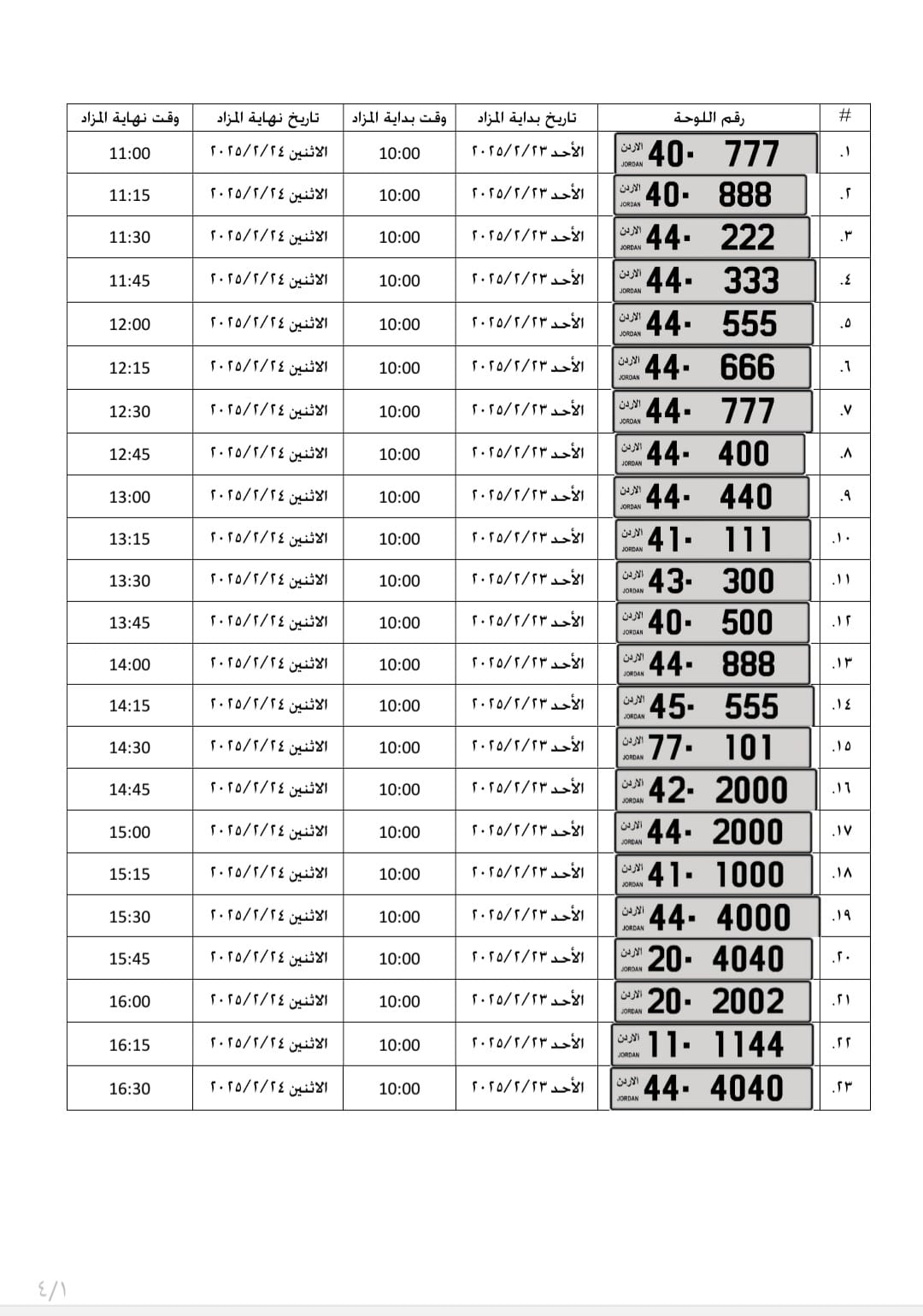 - يبدأ المزاد العلني الالكتروني على جميع الأرقام اعتباراً من يوم الأحد الموافق 23 /2 / 2025م وينتهي المزاد على بعض الأرقام يوم الاثنين الموافق 24 /2 / 2025م وعلى باقي الأرقام يوم الثلاثاء الموافق 25 /2 / 2025م حسب الأوقات المبينة إزاء كل رقم .
