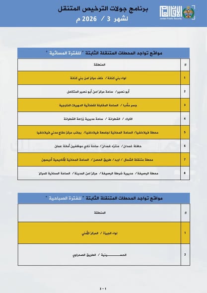 تعلن إدارة ترخيص السواقين والمركبات عن مواعيد العمل بجولات الترخيص المتنقل الصباحي والمسائي ضمن المبادرة الابتكارية ( بنوصلك ) خلال شهر آذار لعام 2026 في عدد من مناطق المملكة.