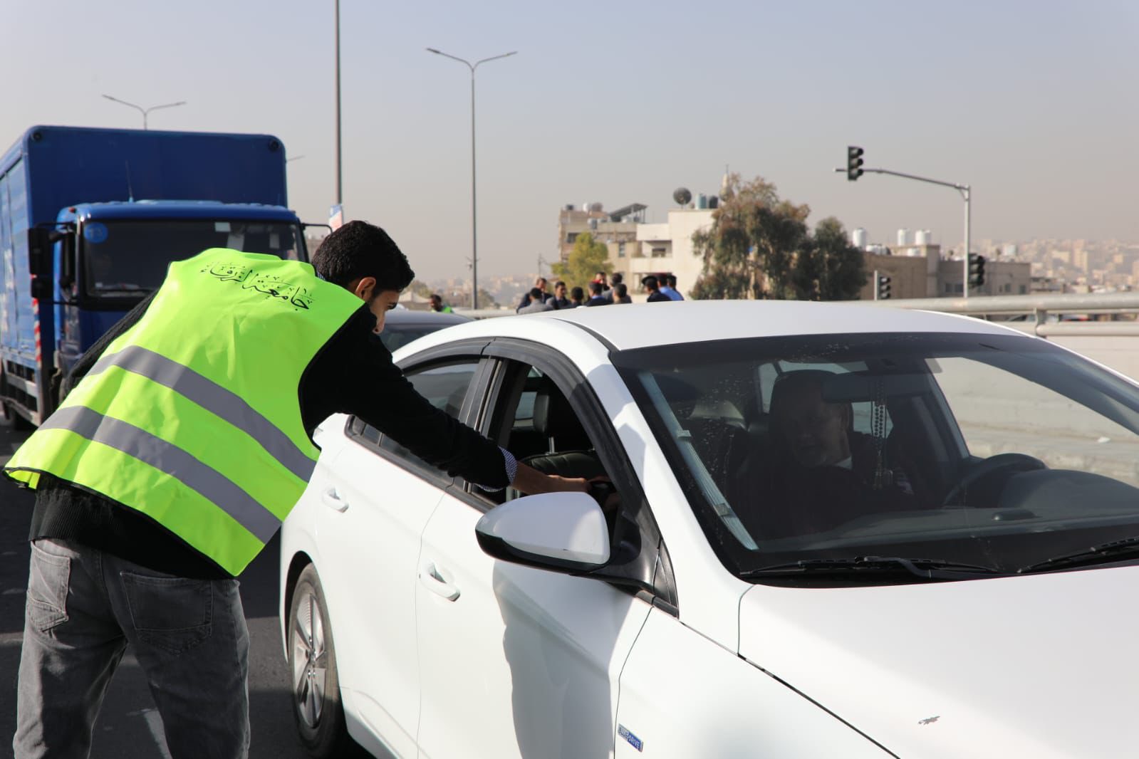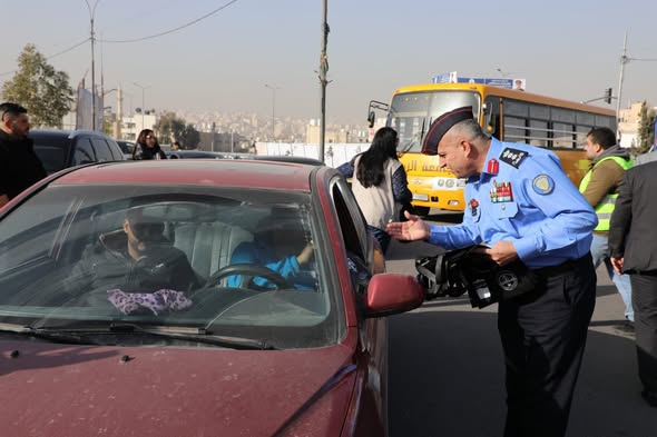 جانب من مشاركة مرتبات الأمن العام في الحملة البيئية "خلّي كيسك بسيارتك"، التي تم إطلاقها في محافظة الزرقاء بتنظيم من وزارتي البيئة والشباب وجامعة الزرقاء الأهلية.