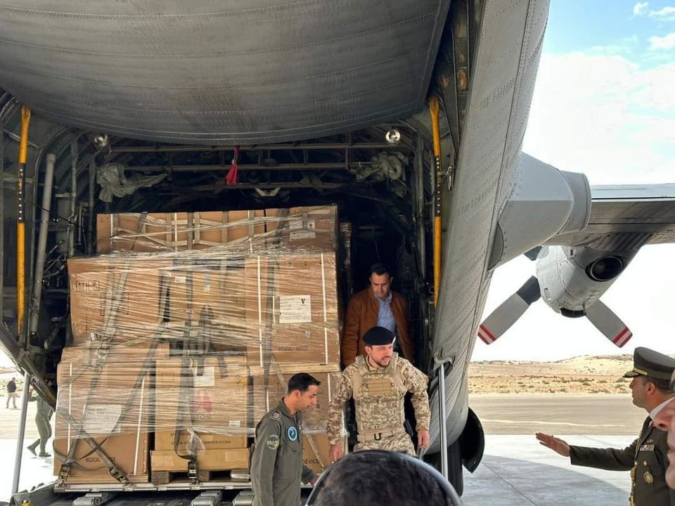 ووصل سمو ولي العهد إلى مطار العريش الدولي على متن طائرة عسكرية تابعة لسلاح الجو الملكي الأردني تحمل على متنها كوادر المستشفى ومعدات وأجهزة طبية