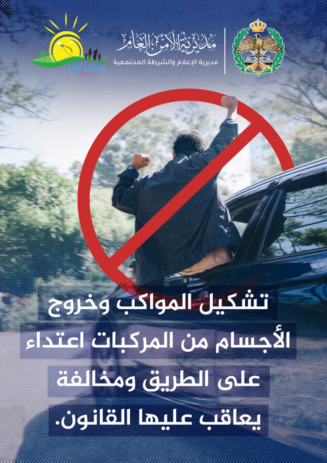 حذّرت مديرية الأمن العام المواطنين من مخالفة تشكيل المواكب وخروج الأجسام من نوافذ المركبات، مؤكدة أن هذه السلوكيات تشكل خطراً كبيراً على السلامة العامة وتعيق الطريق، وتعدّ مخالفة صريحة يعاقب عليها القانون.