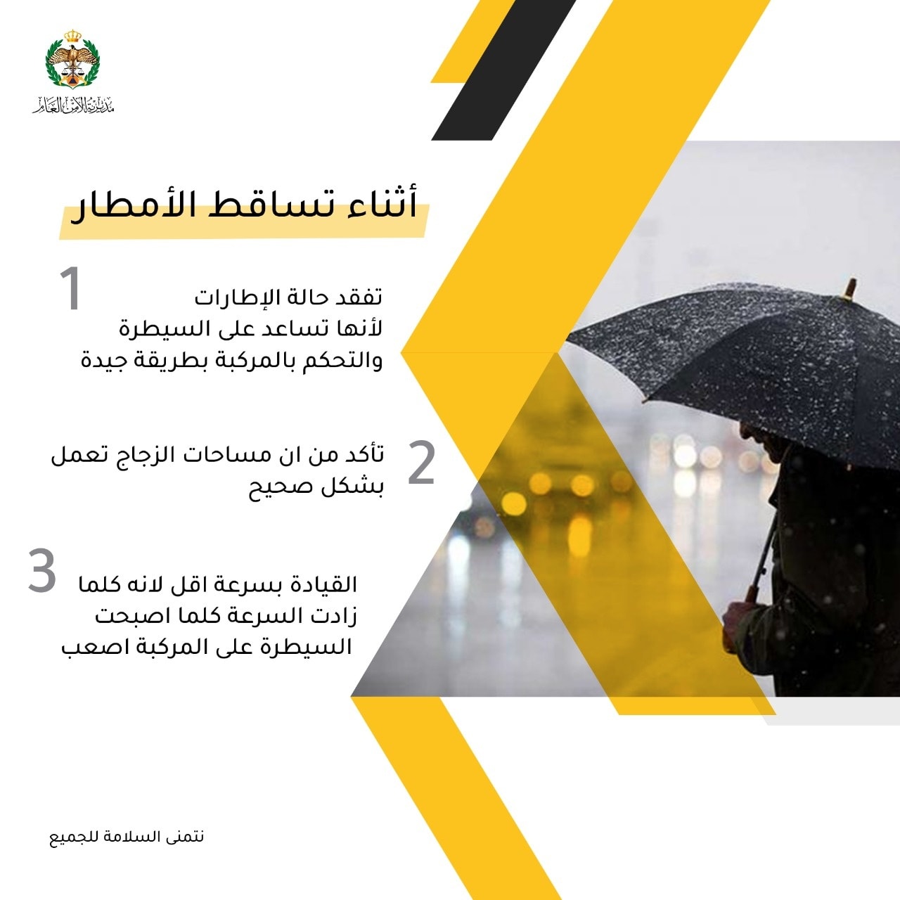 تهيب مديرية الأمن العام بالأخوة المواطنين ضرورة اخذ الحيطة والحذر وانتهاج السلوك السليم خلال حالة عدم الاستقرار الجوي السائدة.