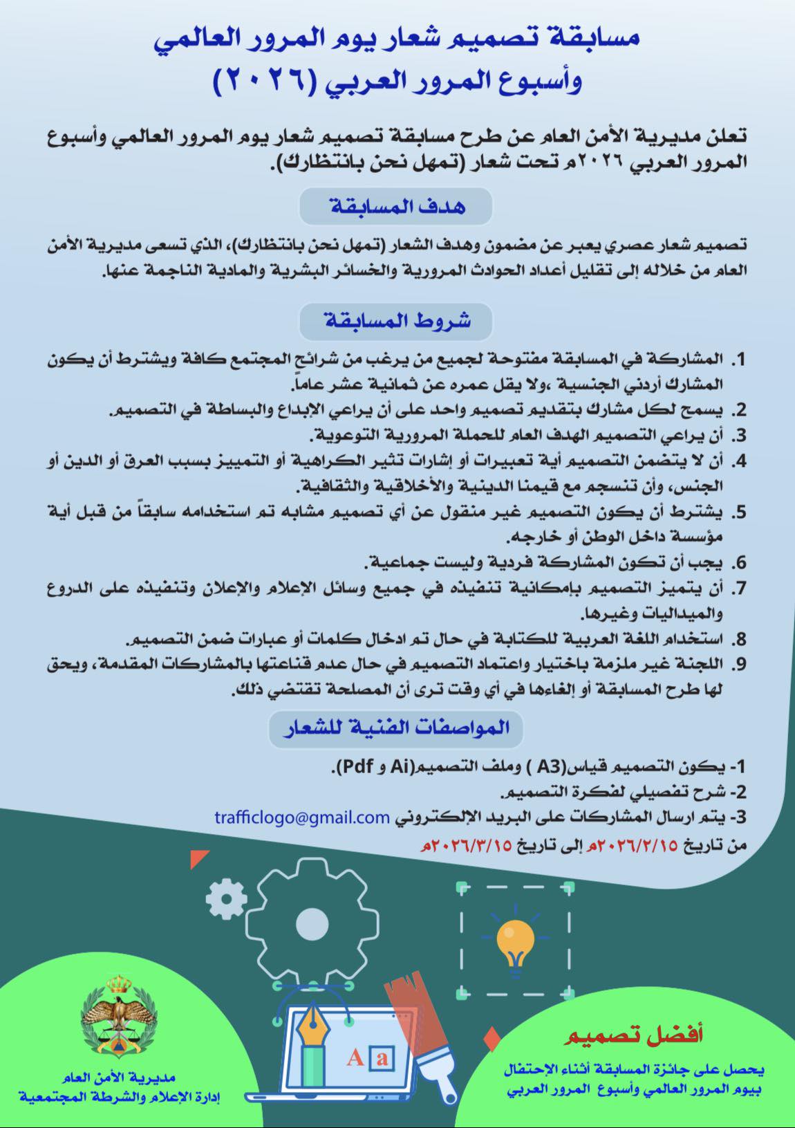 تعلن مديرية الأمن العام عن إطلاق مسابقة لتصميم شعار خاص بيوم المرور العالمي وأسبوع المرور العربي، تحت شعار (تمهل نحن بانتظارك).