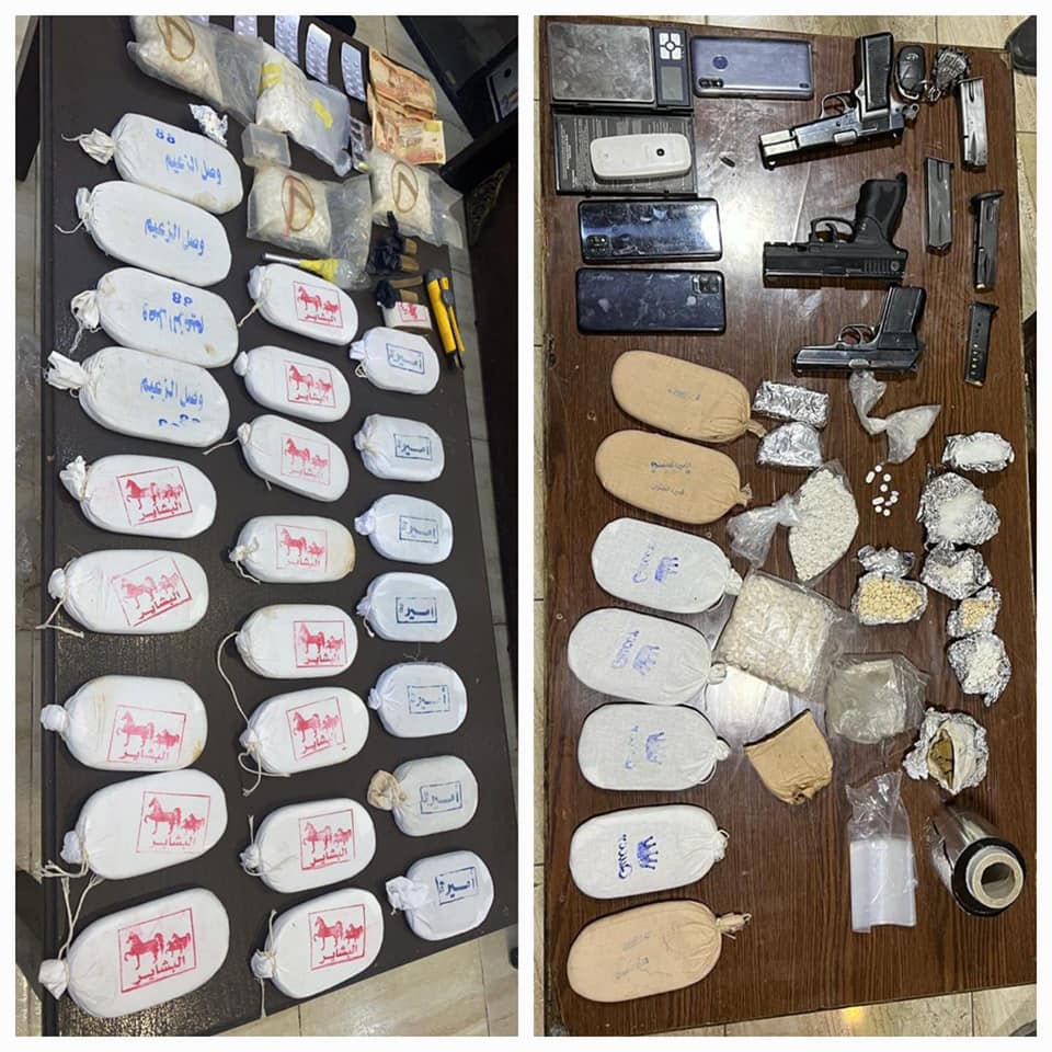 ففي القضية الأولى وبعد جمع المعلومات حول قيام أحد الأشخاص بالاتجار وترويج المواد المخدرة في البادية الشمالية، إذ تمت مداهمته وإلقاء القبض عليه وضُبط بحوزته 35 كف حشيش و 12 الف حبة كبتاجون مخدرة بالإضافة الى سلاح ناري.