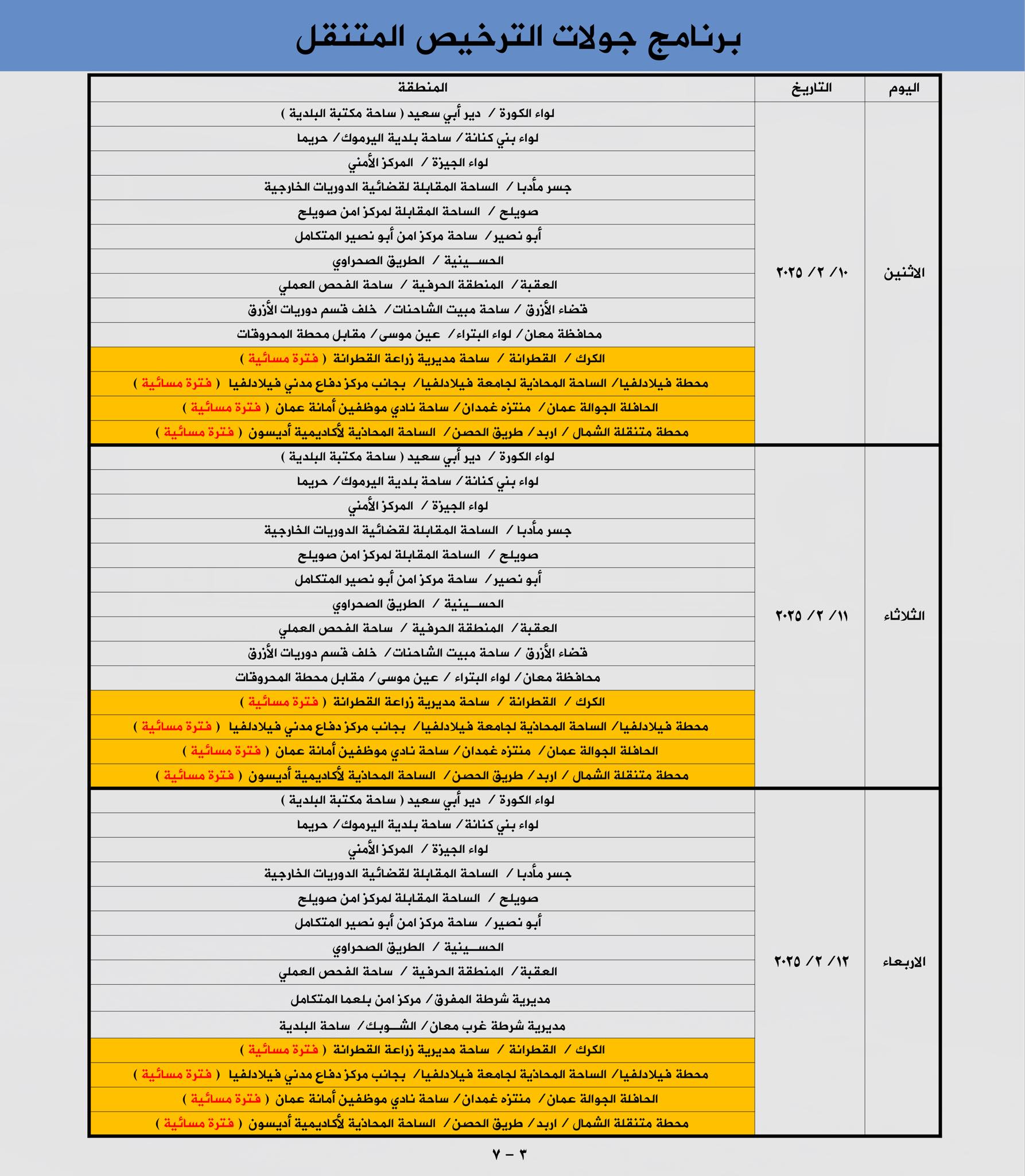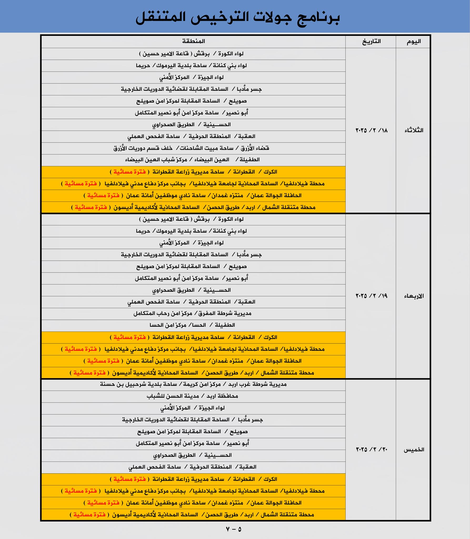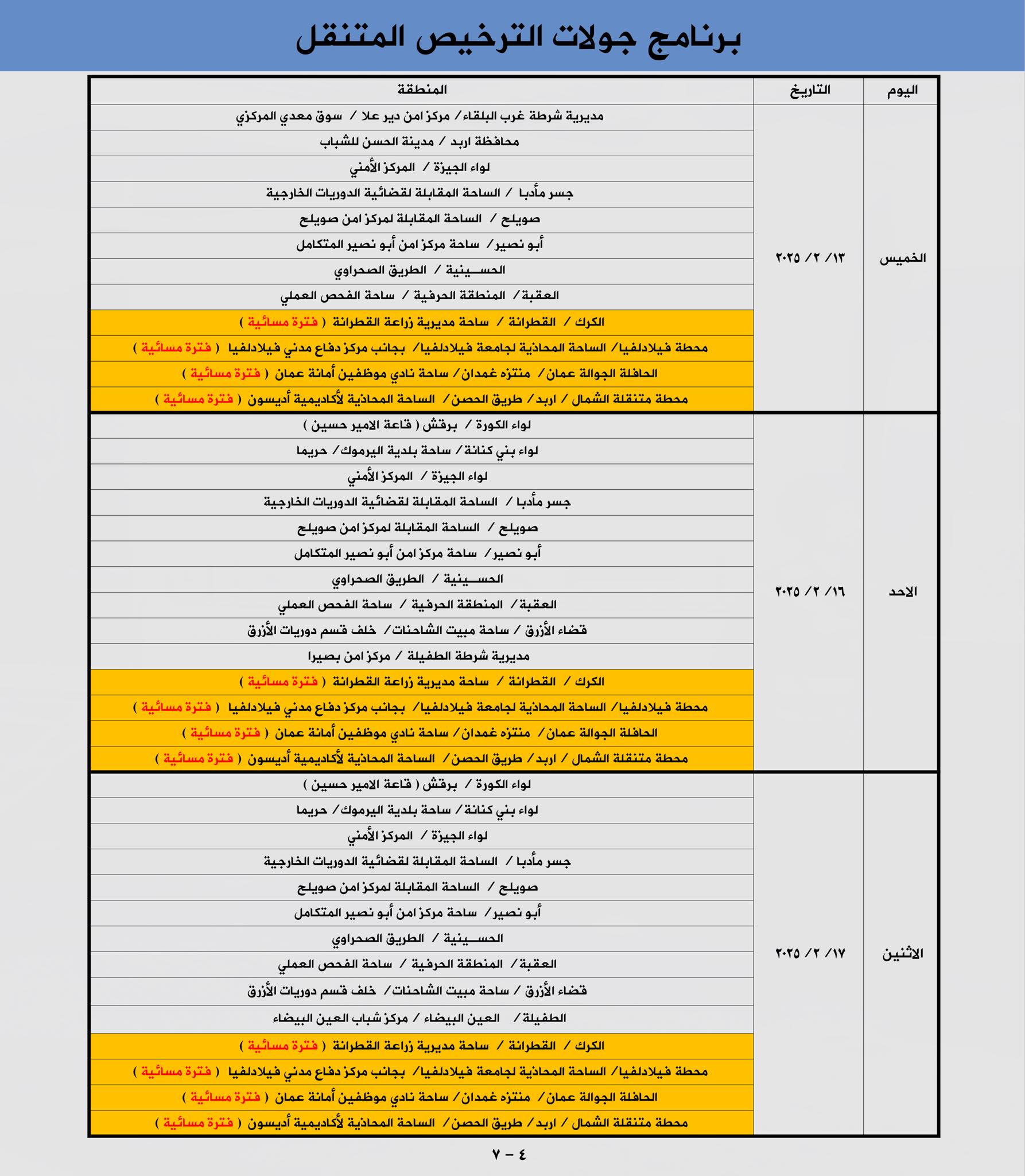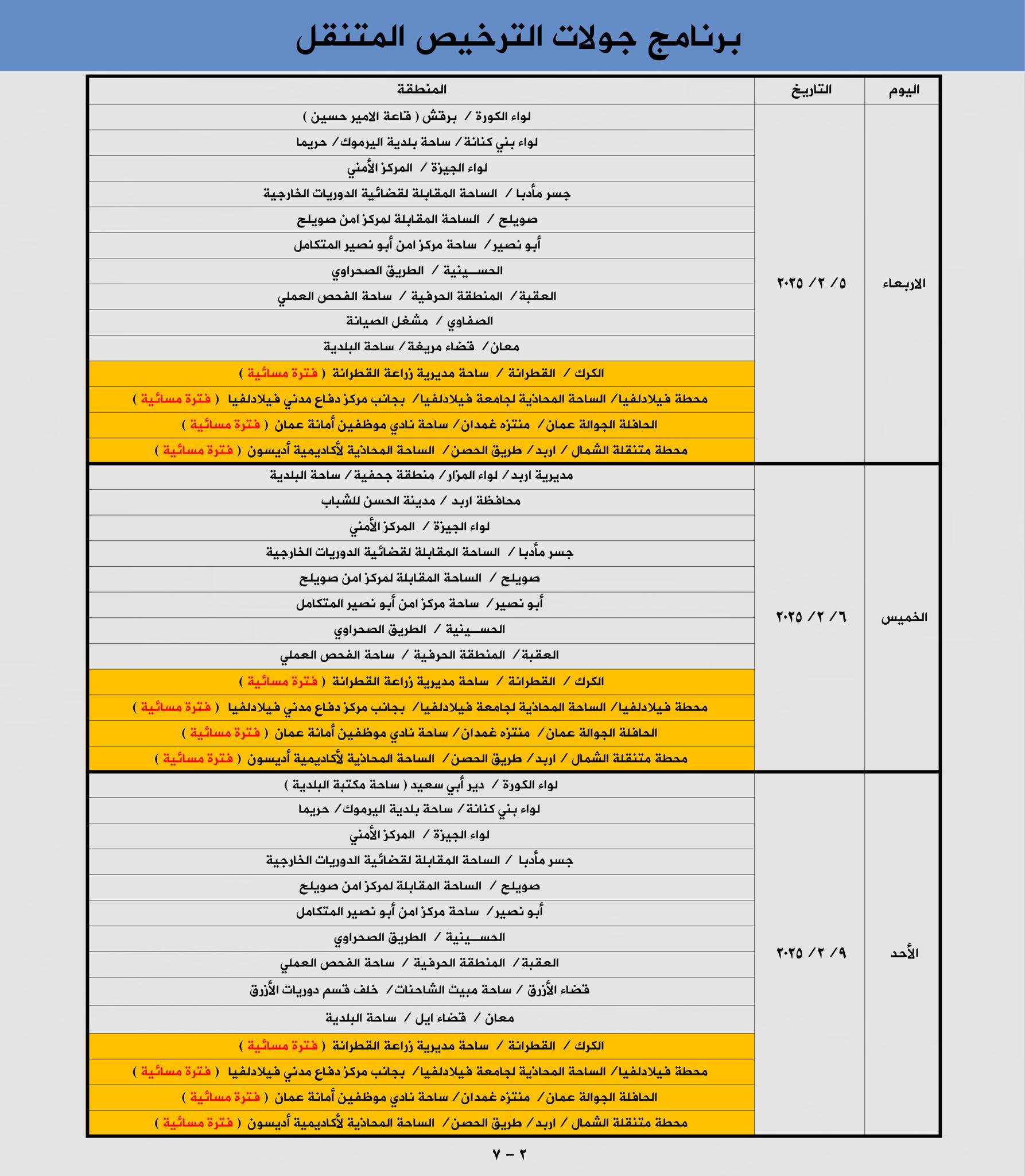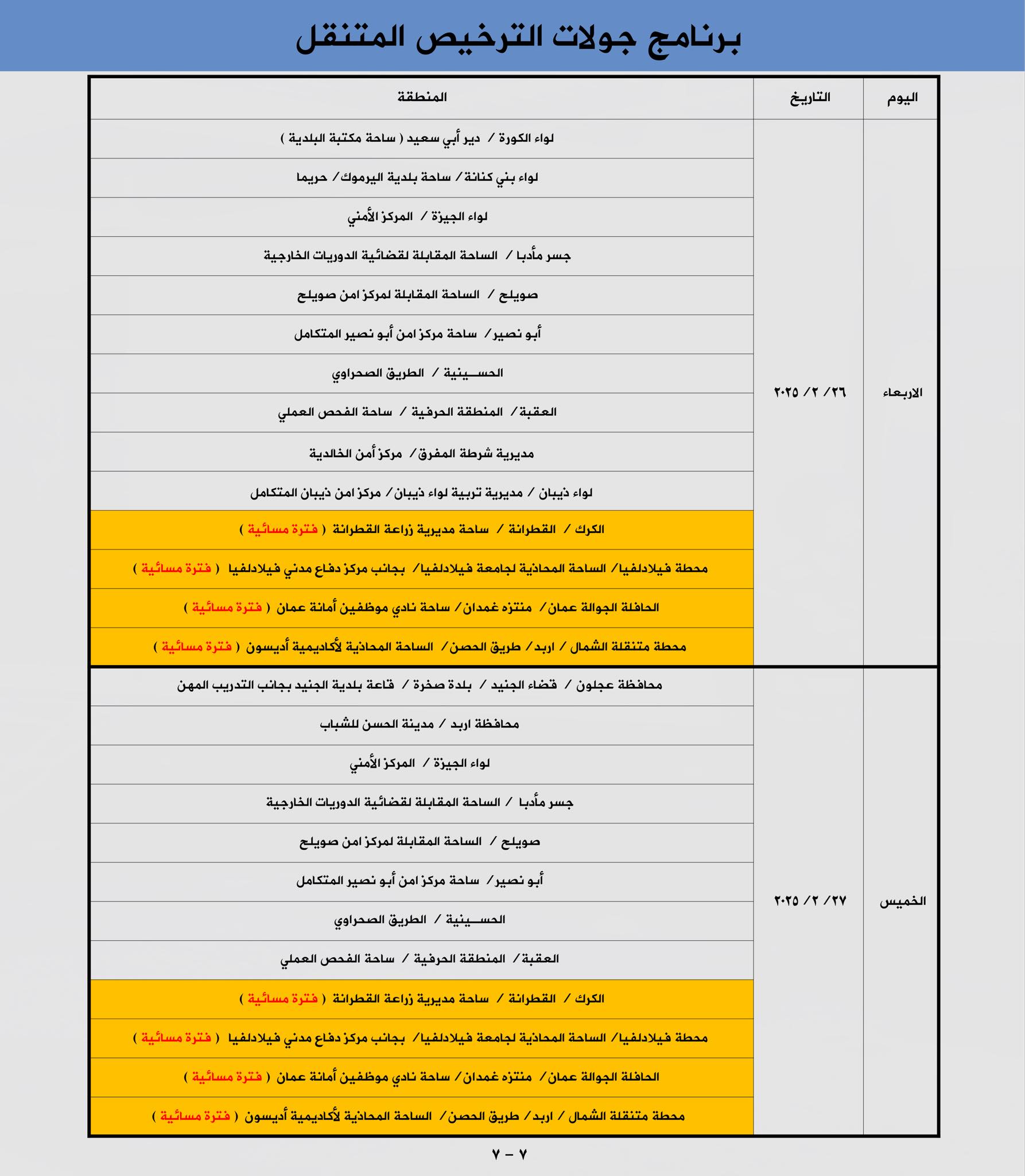 إدارة ترخيص السواقين والمركبات تعلن عن مواعيد العمل بجولات الترخيص المتنقل ضمن المبادرة الابتكارية ( بنوصلك ) خلال شهر شباط لعام 2025 في عدد من مناطق المملكة، حيث ستكون ساعات الدوام من يوم الأحد ولغاية يوم الأربعاء من الساعة 8:00 صباحاً وحتى الساعة 2:00 ظهراً، ويوم الخميس من الساعة 8:00 صباحاً ولغاية الساعة 1:00 ظهراً.