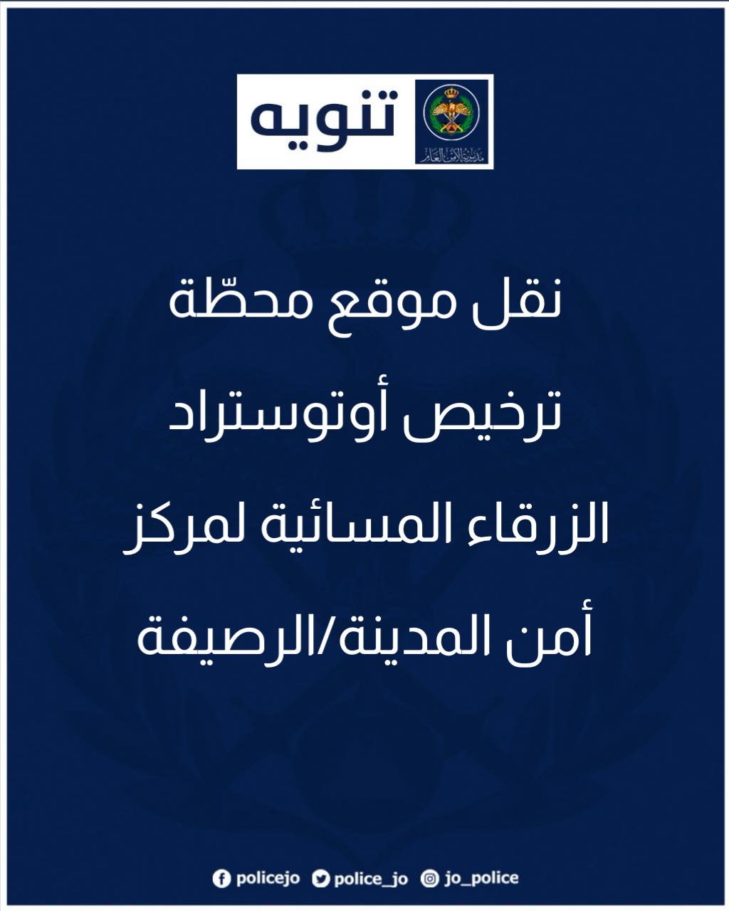 أعلنت إدارة ترخيص السواقين والمركبات أنه وابتداء من هذا اليوم سيتم نقل محطة الترخيص المسائية / أوتوستراد الزرقاء لموقعها الجديد داخل مركز أمن المدينة/ الرصيفة، بعد تجهيزه لاستقبال المراجعين وتقديم كافّة خدمات الترخيص لهم باستثناء الفحصين: النظري والعملي، إضافة إلى توفير خدمات لوحات الأرقام وبالتوقيت ذاته من الساعة الثالثة عصراً لغاية الثامنة مساءً.