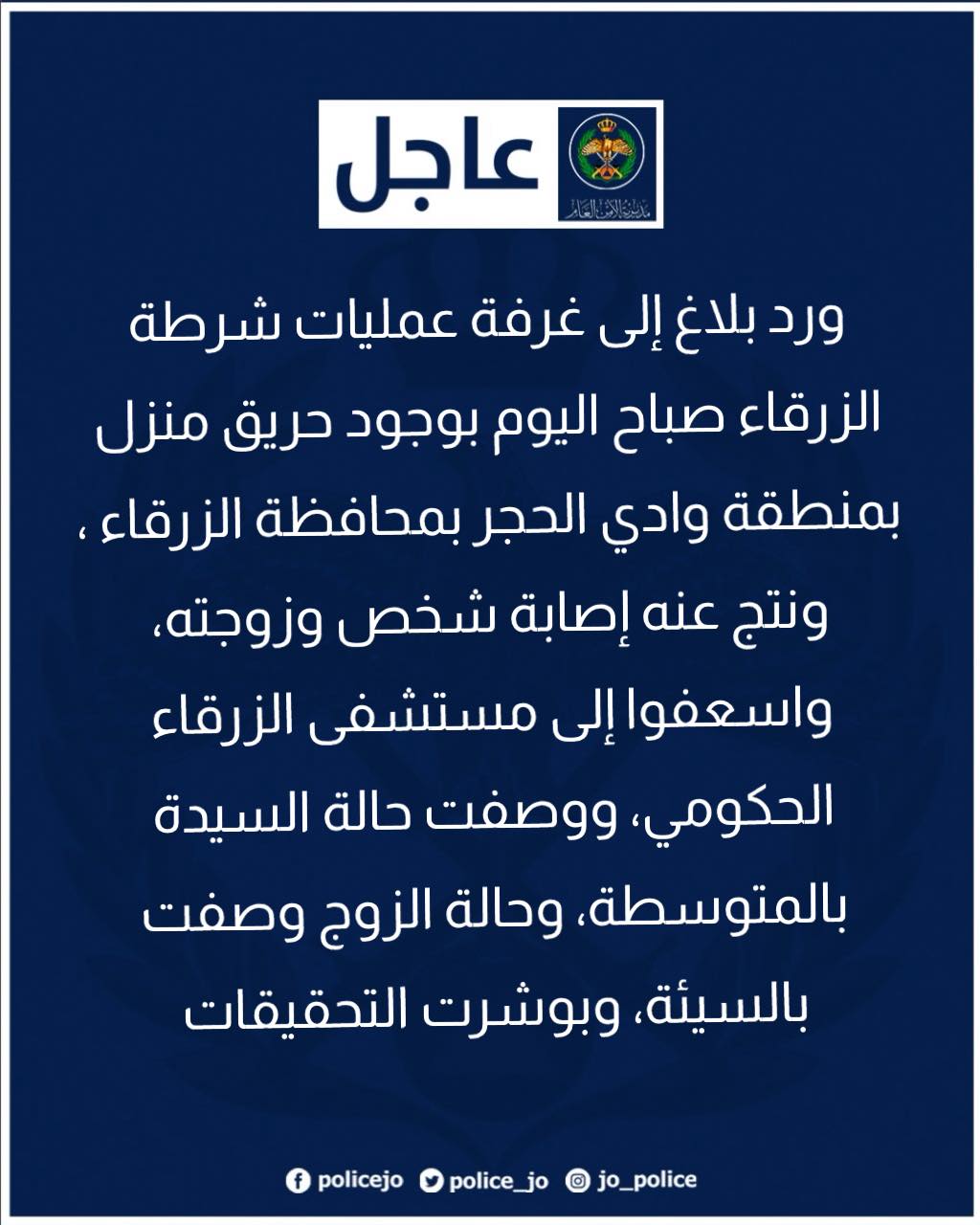 ورد بلاغ إلى غرفة عمليات شرطة الزرقاء صباح اليوم بوجود حريق منزل بمنطقة وادي الحجر بمحافظة الزرقاء ، ونتج عنه إصابة شخص وزوجته، واسعفوا إلى مستشفى الزرقاء الحكومي، ووصفت حالة السيدة بالمتوسطة، وحالة الزوج وصفت بالسيئة، وبوشرت التحقيقات