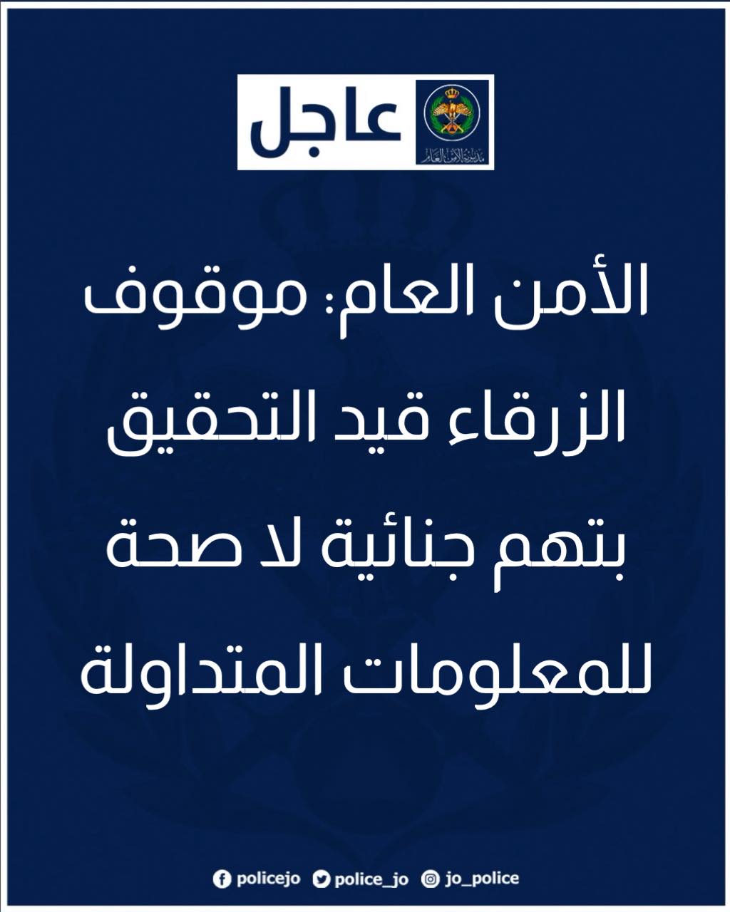 الأمن العام: موقوف الزرقاء قيد التحقيق بتهم جنائية لا صحة للمعلومات المتداولة