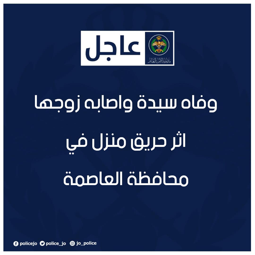 وفاه سيدة واصابه زوجها اثر حريق منزل في محافظة العاصمة