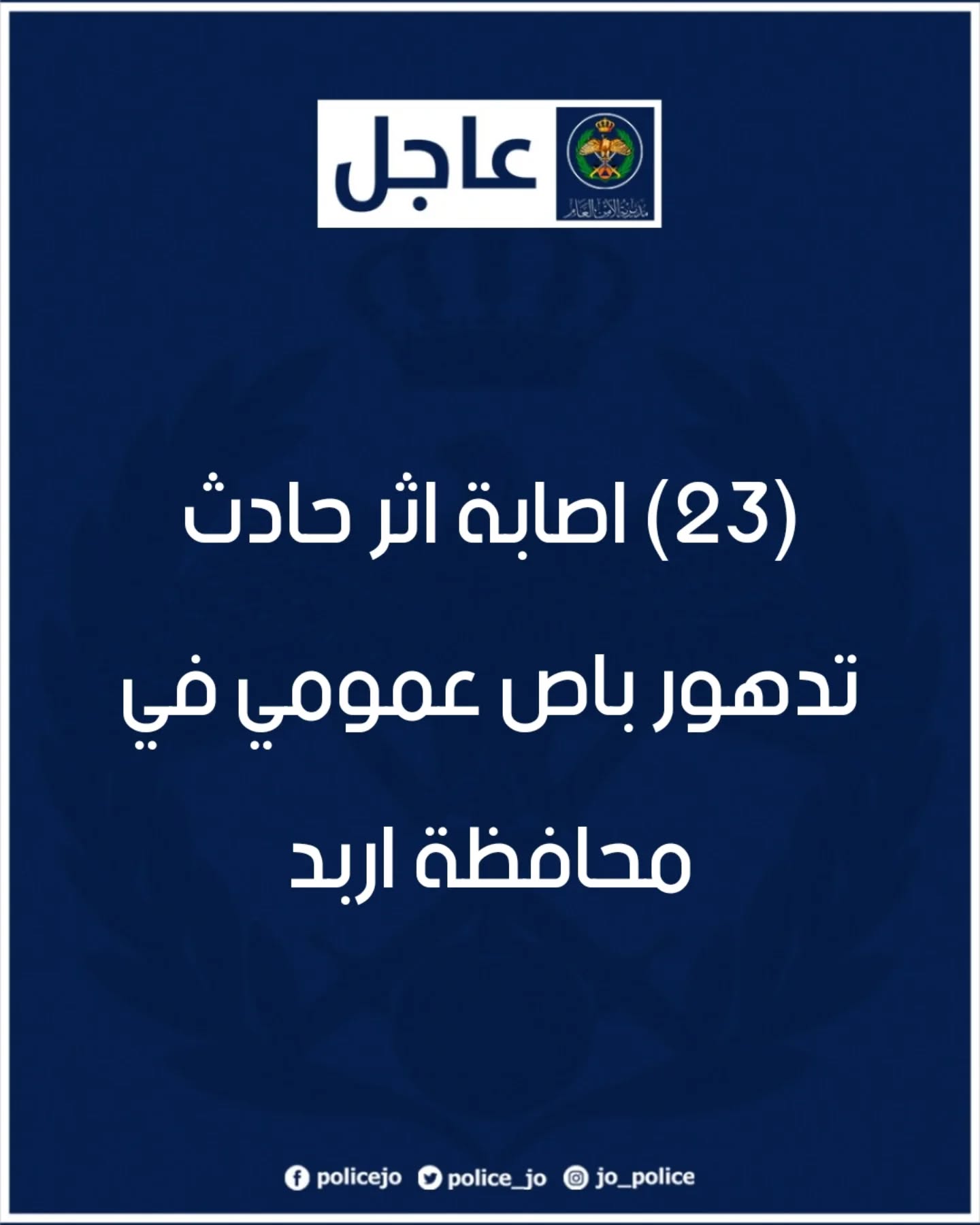 إصابة 23 شخص إثر حادث تدهور باص عمومي في محافظة اربد