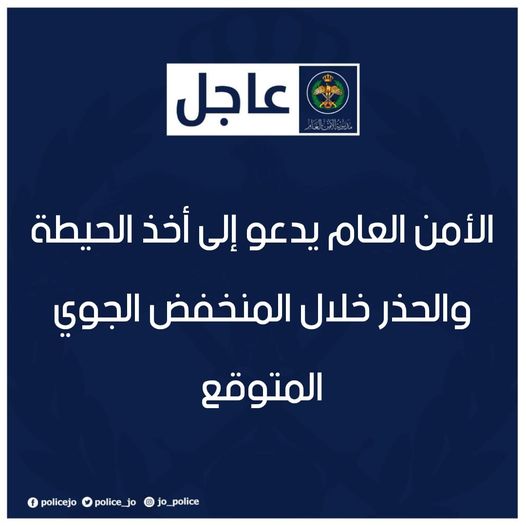 أهابت مديرية الأمن العام بالمواطنين باخذ الحيطة والحذر خلال المنخفض الجوي المتوقع ابتداء من هذه الليلة