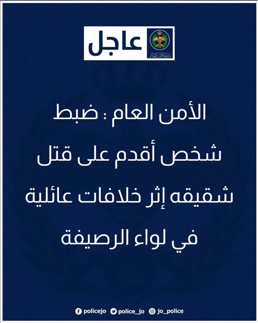 الأمن العام : ضبط شخص أقدم على قتل شقيقه إثر خلافات عائلية في لواء الرصيفة