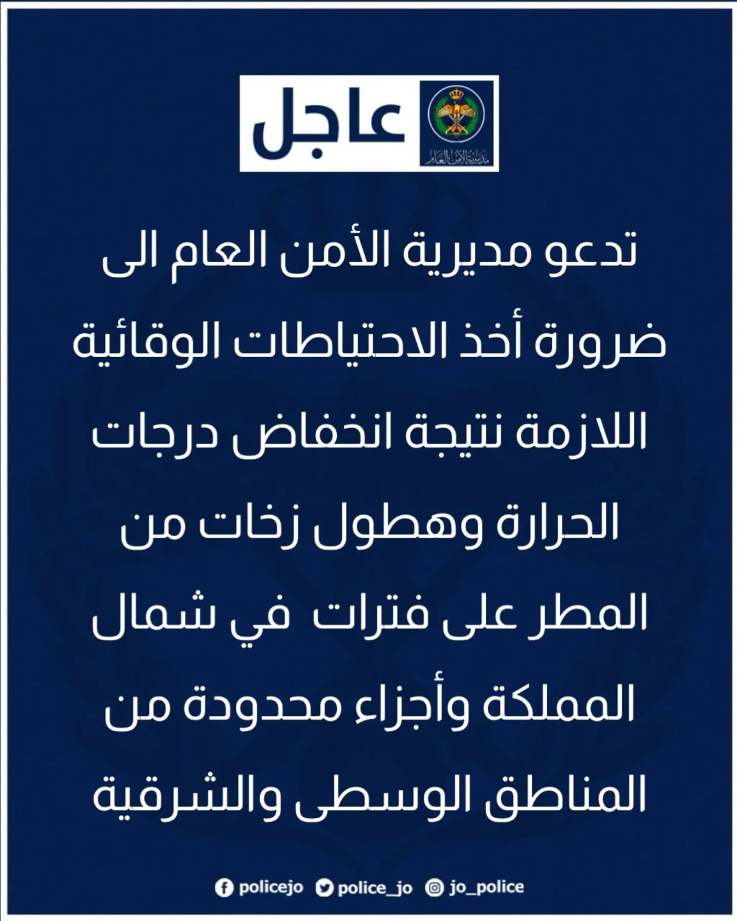 مديرية الأمن العام تدعو الى ضرورة أخذ الاحتياطات الوقائية نتيجة انخفاض درجات الحرارة