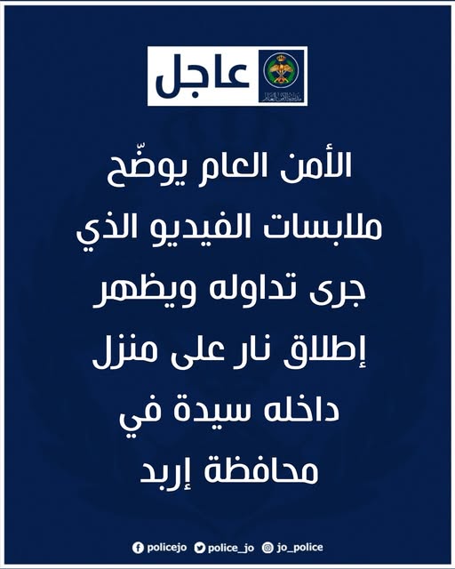 الأمن العام يوضّح ملابسات الفيديو الذي جرى تداوله ويظهر إطلاق نار على منزل داخله سيدة في محافظة إربد