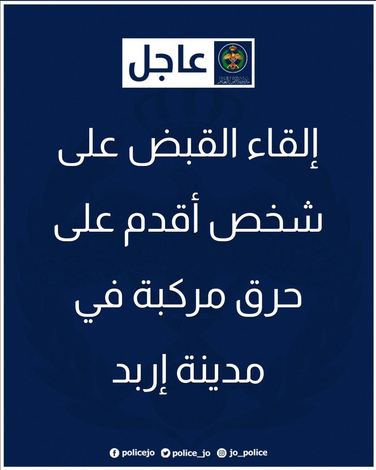 قال الناطق الإعلامي باسم مديرية الأمن العام إنّ بلاغاً ورد لمديرية شرطة محافظة إربد والبحث الجنائي بقيام شخص مجهول بإشعال النار