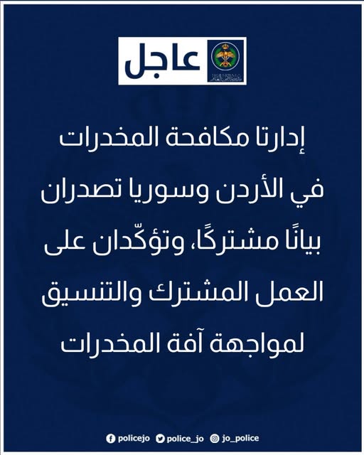 أصدرت إدارة مكافحة المخدرات في المملكة الأردنية الهاشمية وإدارة مكافحة المخدرات في الجمهورية العربية السورية بيانًا مشتركًا