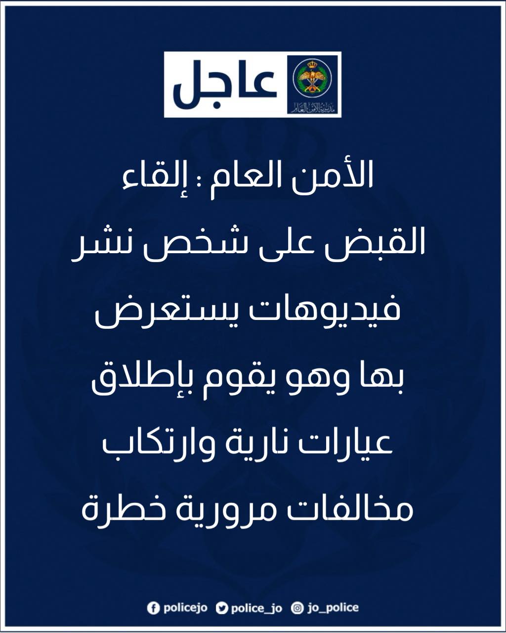 الأمن العام : إلقاء القبض على شخص نشر فيديوهات يستعرض بها وهو يقوم بإطلاق عيارات نارية وارتكاب مخالفات مرورية خطرة