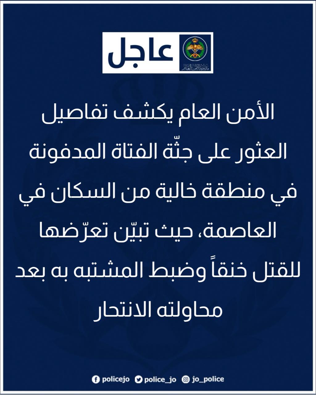 الأمن العام يكشف تفاصيل العثور على جثّة الفتاة المدفونة في منطقة خالية من السكان في العاصمة، حيث تبيّن تعرّضها للقتل خنقاً وضبط المشتبه به بعد محاولته الانتحار